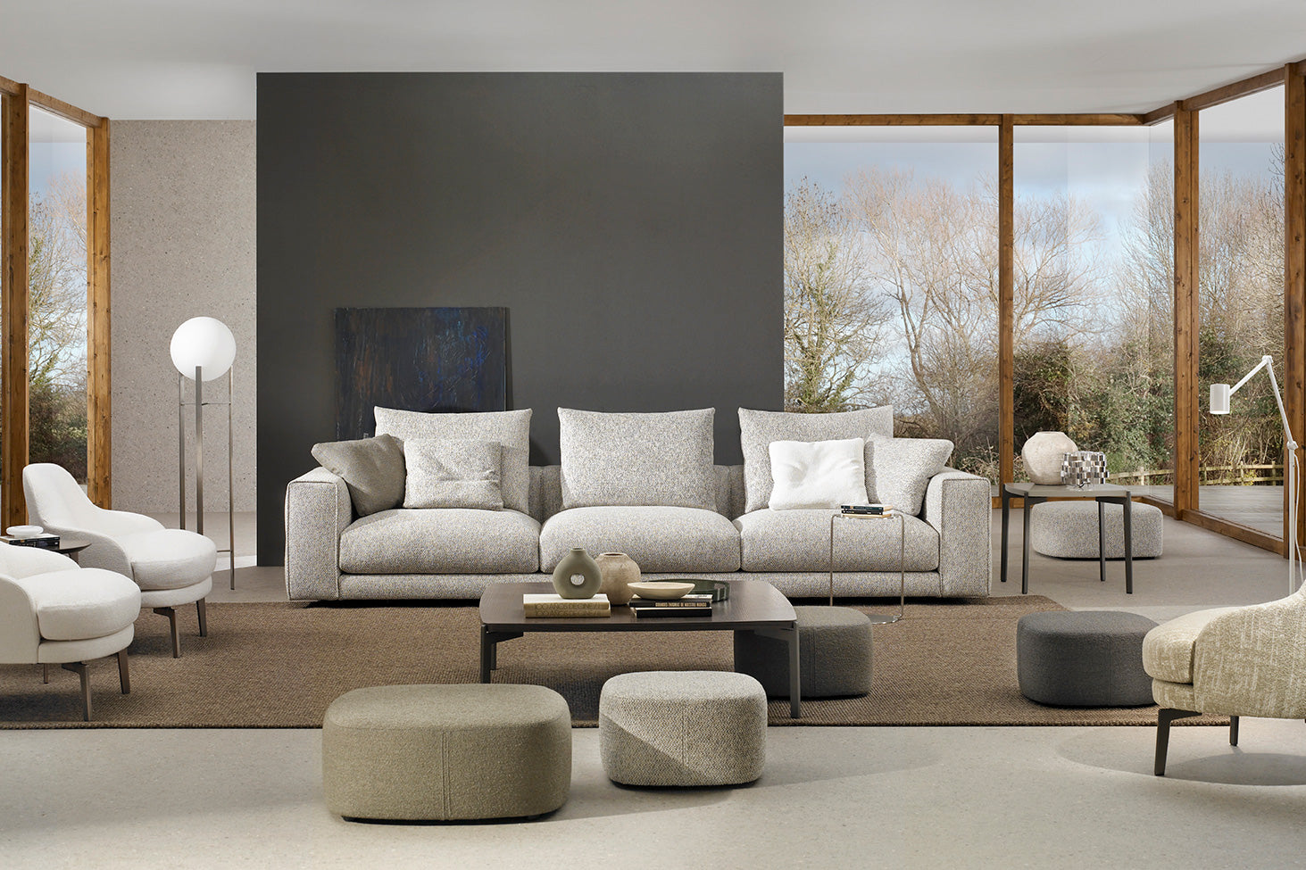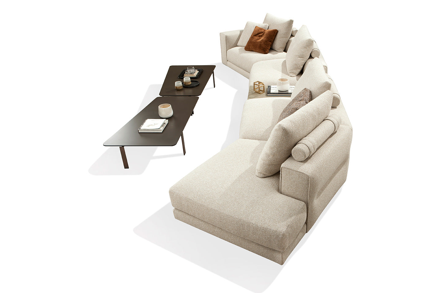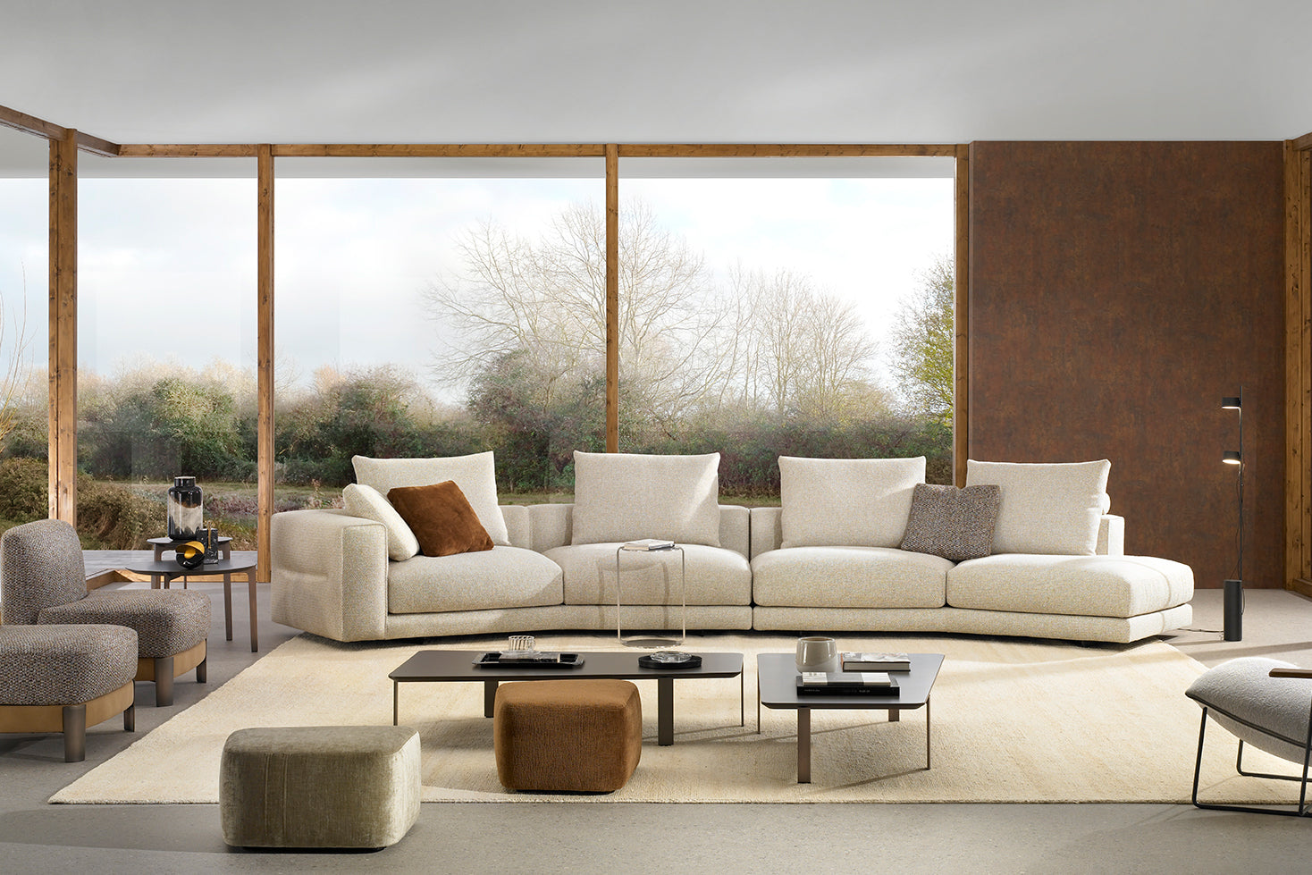 The Alchemy sofa by Casa Desús is a contemporary seating system defined by strong linear geometry and a sense of measured proportion. Its structure is softened by the subtle indentation that runs along the back and arms, while fine piping outlines the armrests with precise craftsmanship. The generous scale and refined presence make it an impressive centerpiece in any living space. The individual-cushion version offers exceptional comfort, with back cushions that blend seamlessly into the frame to create a unified visual rhythm. A distinctive cylindrical bolster, attached to the rear cushions with upholstered straps, adds both function and aesthetic refinement, completing a design that reflects the elegance, comfort, and thoughtful detailing of Casa Desús furniture.