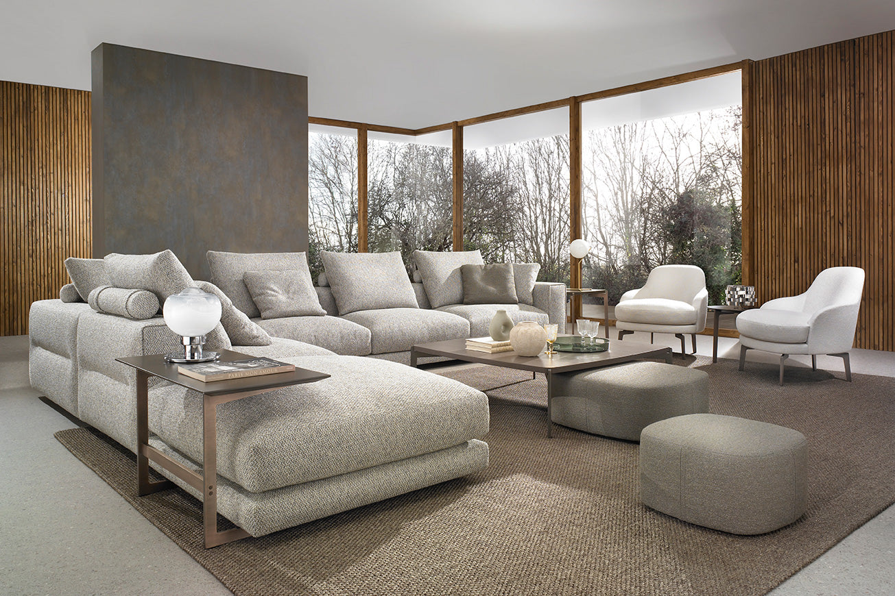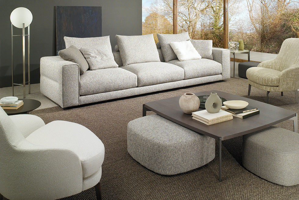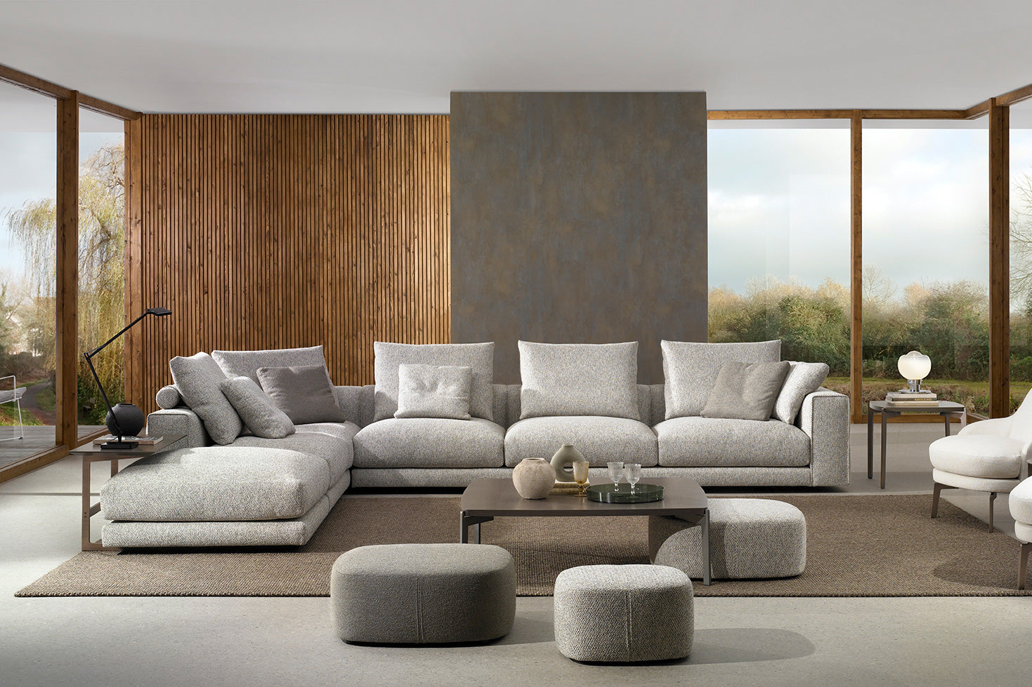 The Alchemy sofa by Casa Desús is a contemporary seating system defined by strong linear geometry and a sense of measured proportion. Its structure is softened by the subtle indentation that runs along the back and arms, while fine piping outlines the armrests with precise craftsmanship. The generous scale and refined presence make it an impressive centerpiece in any living space. The individual-cushion version offers exceptional comfort, with back cushions that blend seamlessly into the frame to create a unified visual rhythm. A distinctive cylindrical bolster, attached to the rear cushions with upholstered straps, adds both function and aesthetic refinement, completing a design that reflects the elegance, comfort, and thoughtful detailing of Casa Desús furniture.