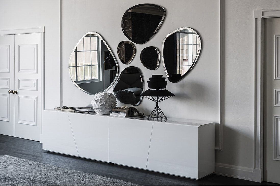Wall mirror in mirrored, smoked grey or bronze mirrored glass with bevelled edges. Wall bracket with fixing possibilities in different positions.