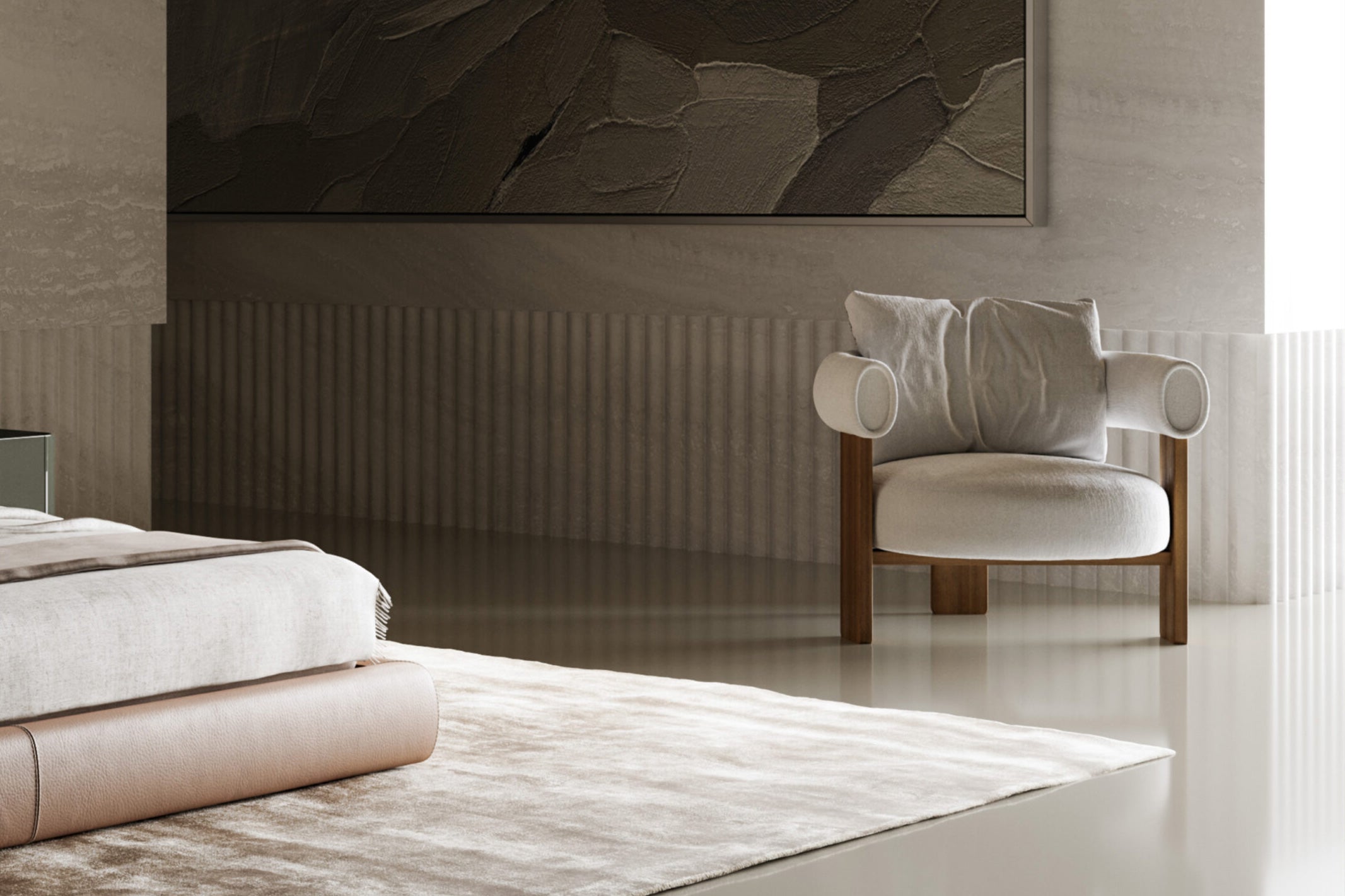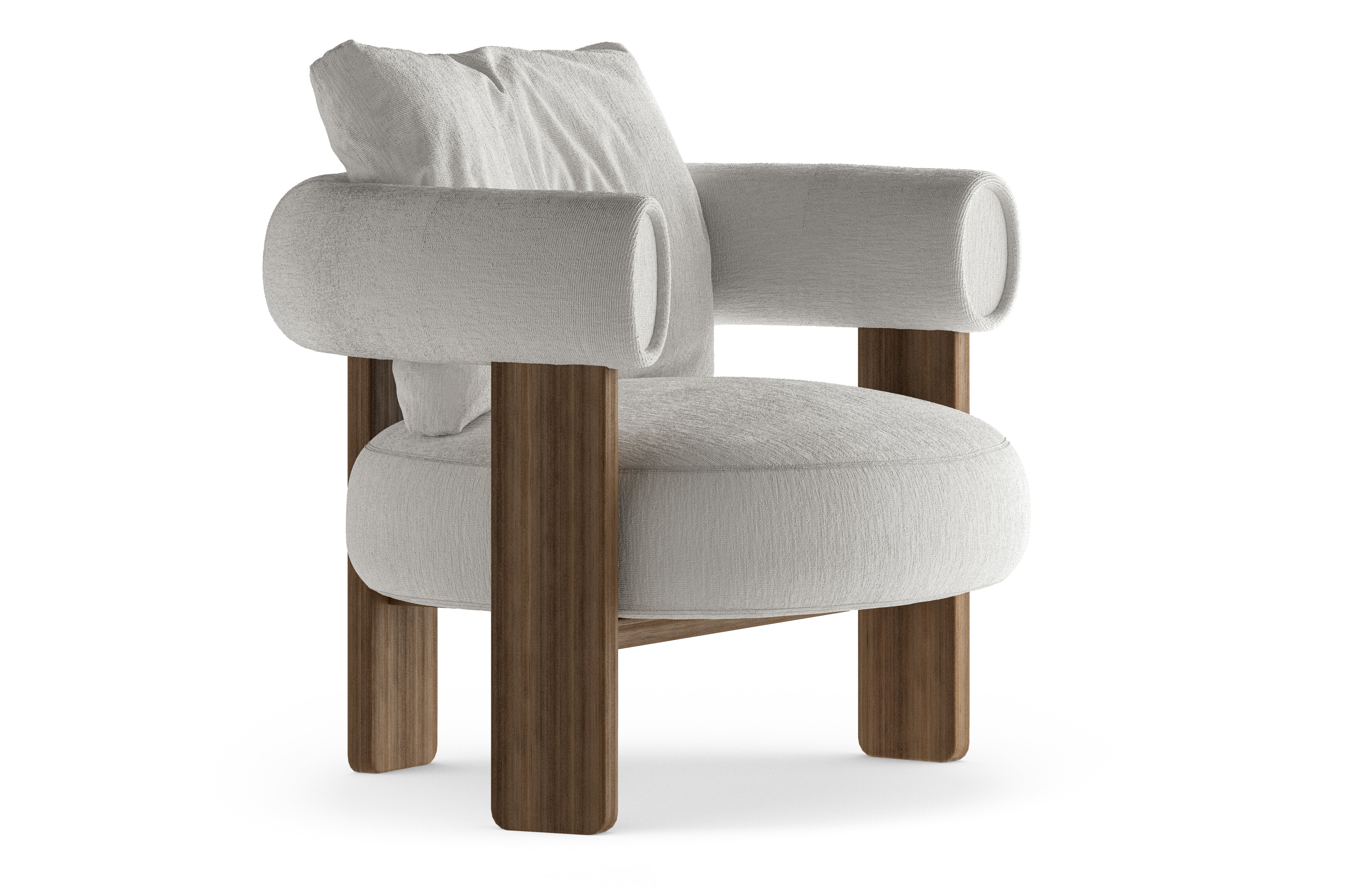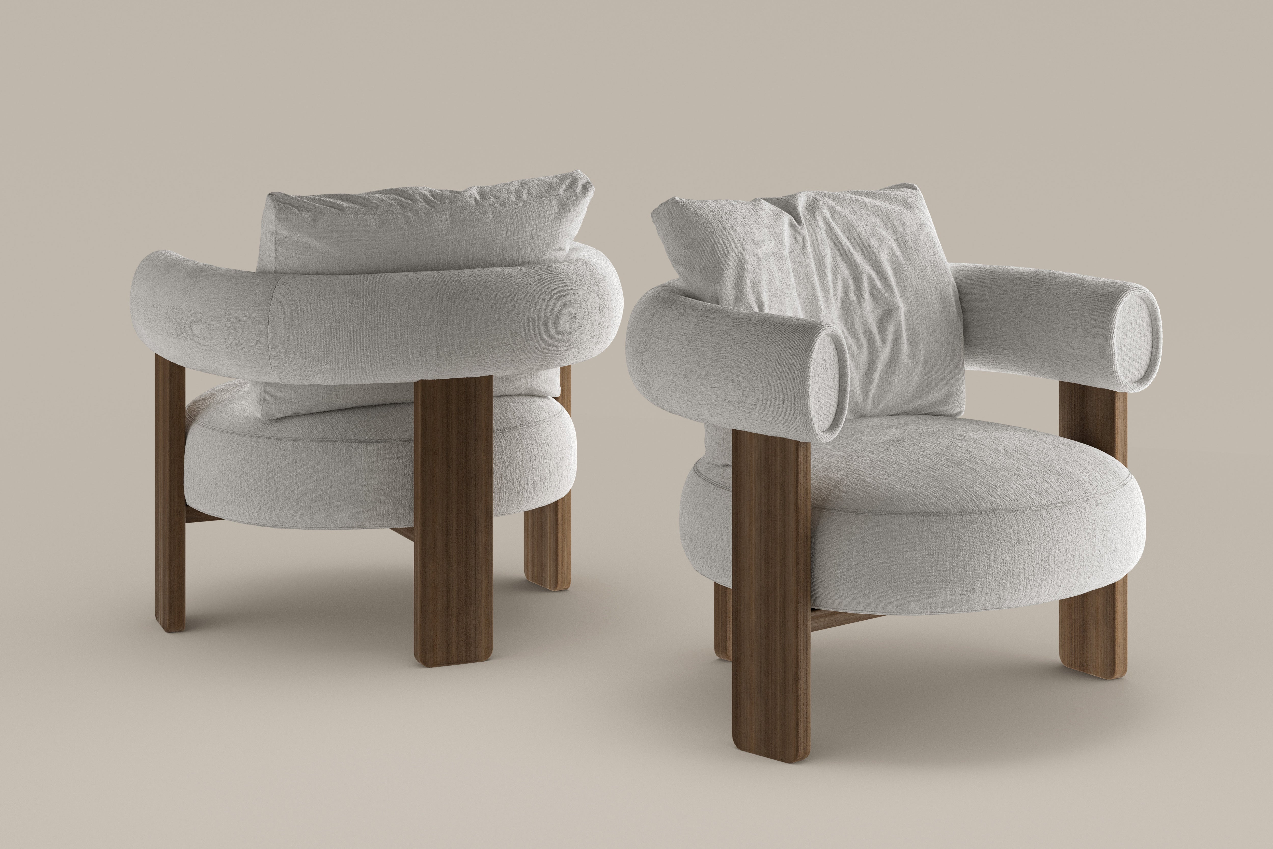 The Bull armchair creates a refined dialogue between contrasting elements, where structure and softness coexist in perfect balance. Its three-legged solid wood frame defines a clear architectural presence, while the generous backrest cushion introduces warmth and comfort, blending firmness with visual lightness. The round seat connects to a continuous tubular element with an elliptical profile that flows from the backrest into the armrest, forming an enveloping gesture that expresses both craftsmanship and precision. Designed with a focus on comfort and proportion, the Bull designer armchair offers an inviting softness that enhances moments of rest and relaxation. Its versatility allows it to complement a sofa arrangement in the living area, stand as a single reading chair, or exist in pairs within a bedroom or lounge corner. With its distinctive balance of stability and ease, the Bull embodies the essence of modern Italian furniture design, combining character, comfort, and timeless elegance in one sculptural piece.