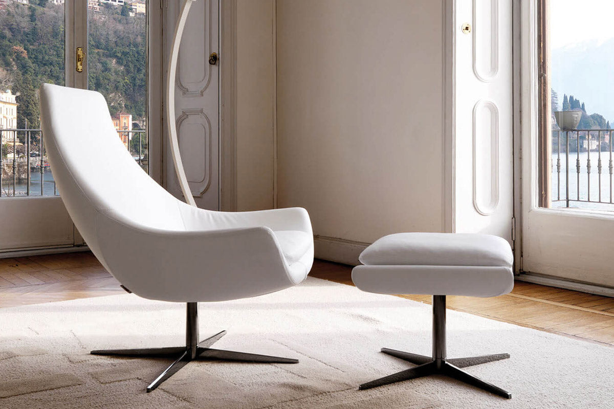 A relaxing armchair and pouf: an organic idea with a very soft effect. Exclusive swivel base. Armchairs inspired by the “Home soft home” philosophy, take on interpreting and transmitting emotions and feelings. Each refined, comfortable product with its distinctive design is genuinely unique. Every detail is there for a reason and is manufactured with skillful care. For us, producing quality means using guaranteed and certified materials, with the attention to detail worthy of a tailor and 100% Made in Italy craftsmanship.