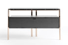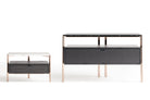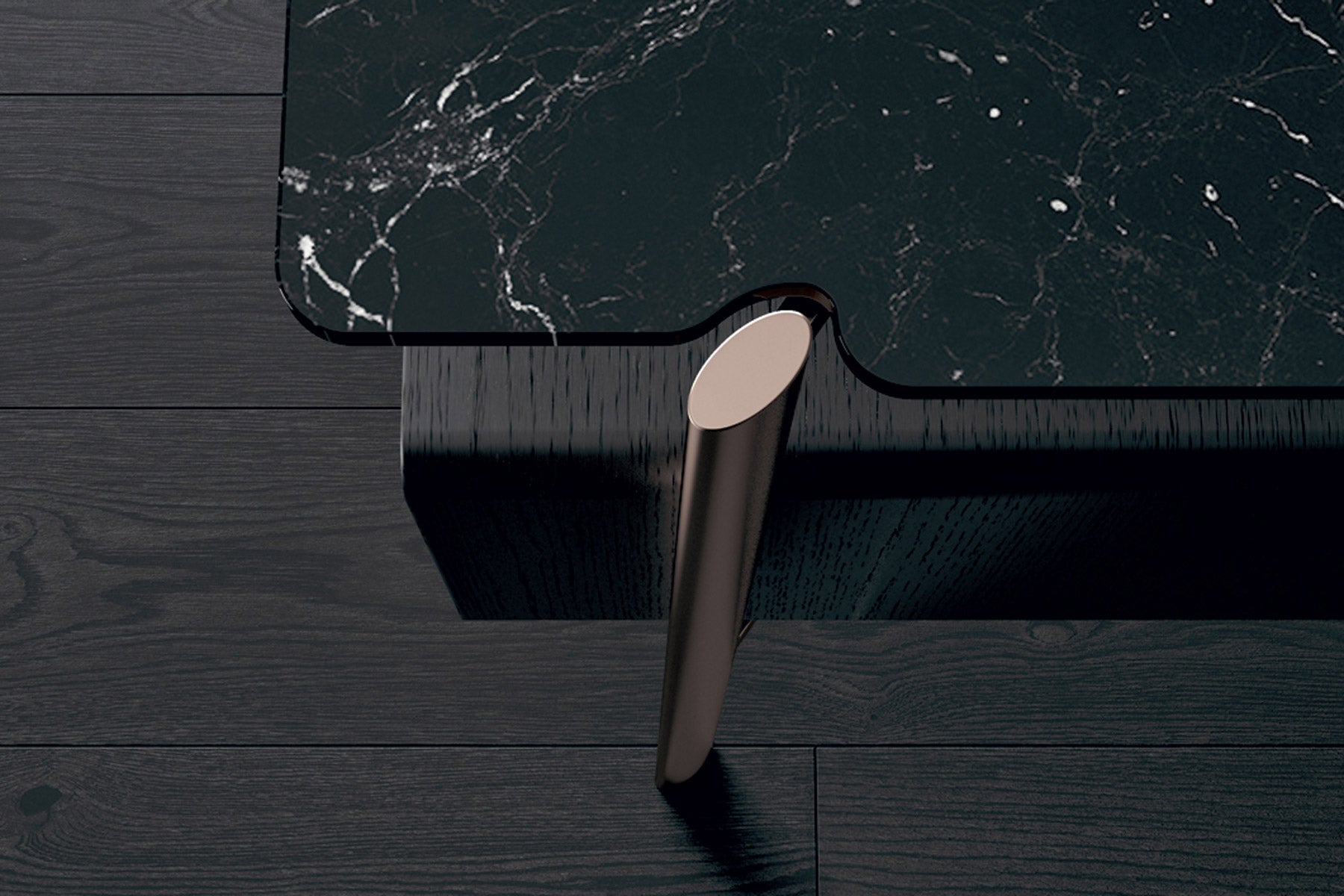 The Eros night group, consisting of a chest of drawers and bedside table, is characterized by the sophisticated dialogue between the different materials that compose it: metal, marble, wood. The bronze painted metal oval diameter structure supports a precious marble support surface through a sophisticated recess inside which it is inserted. The container in black-stained oak is suspended between the top and the floor, making it light and ethereal.