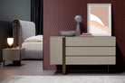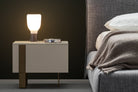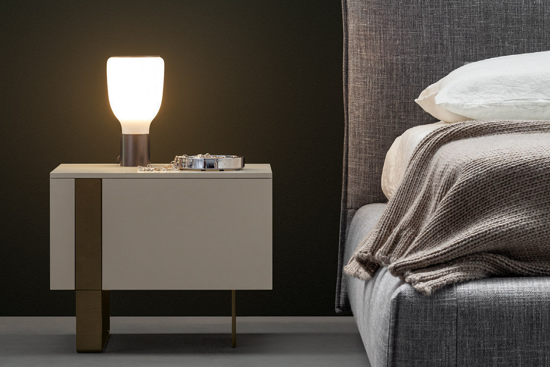 Antibes is a storage system designed for the bedroom area that draws inspiration from the traditional shapes of dressers and bedside tables and then deviates from them, taking the geometry of the designs to an extreme. The asymmetrical metal base supporting the lacquered wooden structure adds a distinctive original and modern touch. On one side of the element the base runs vertically along the entire front section of the dresser or bedside table until it touches the ground; on the other side, it becomes slender and thin, as though wishing to disappear. The elements in the Antibes collection are available in three different colour combinations: sand lacquered wooden frame and taupe-coloured metal base, rope lacquered wooden frame and bronze finish metal base, mud lacquered wooden frame and lead finish metal base.