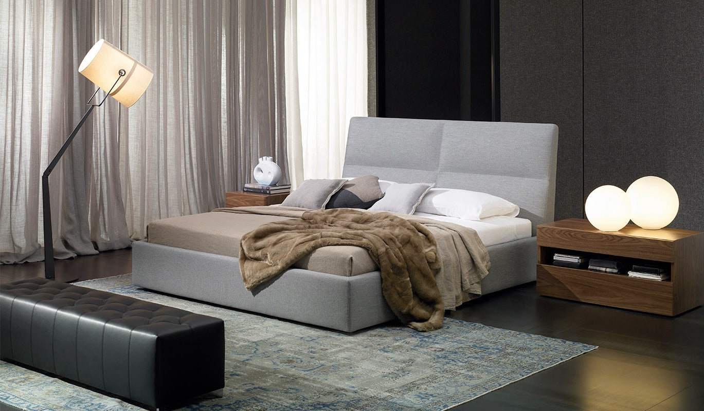 The main characteristic of the Kross bed collection is its quadruple curvature at its headboard, which makes its sign of identity. The upholstered frame permits two different types of height regulation: telescopic feet allow to raise the whole bed. the height between slat and frame can be levelled according to the type of slat.