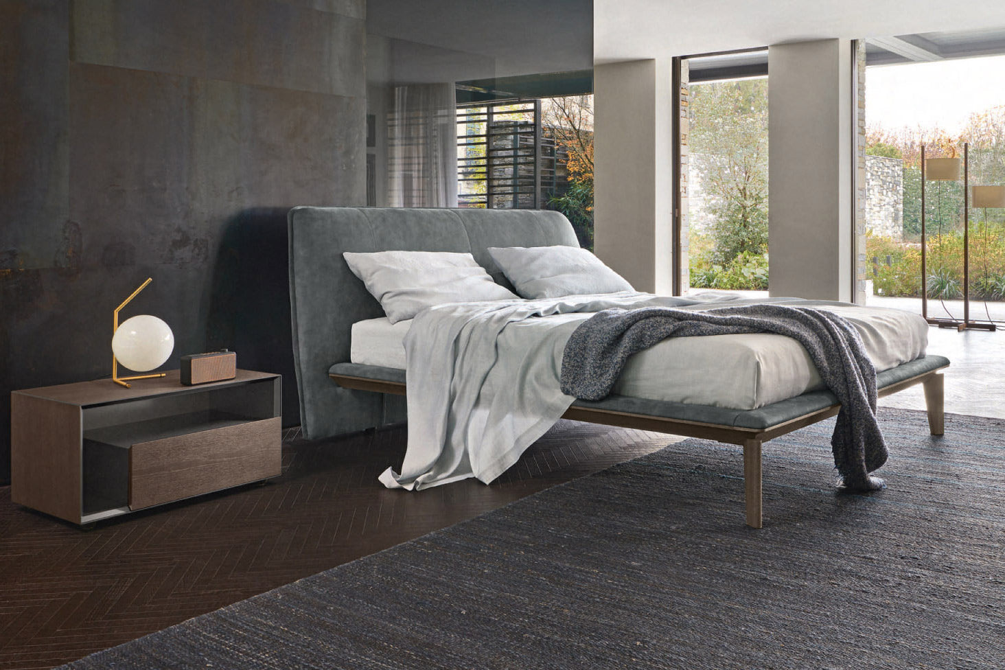 A Well-balanced combination of different finishes distinguishes this solid, beautifully crafted wood bed that appears light and airy, with pleasently cosy upper part in shaped polyurethane foam. Removable fabric, eco leather or leather upholstery for the headboard, not removable bed frame. The shape legs are in solid wood or metal foils that come together to create an attractive void. The elegant headboard, with its sartorial edging, is designed to give its best in the centre of a room.