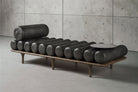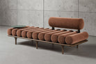 The Five to Nine daybed draws inspiration from 1900s scenic designs that portrayed a place for creative escape – a space as physical as it was mental – the studios of the great artists. Designed by Milan-based Studiopepe, the Five to Nine daybed is the star player in a fictitious artist’s studio, a cosmopolitan, contemporary space, cradle of creative genius. With bolster pillows that run its entire length, the daybed has a bold personality and is super-versatile. Thanks to the array of upholstery options possible, it can fill many needs and fit in different settings – upholstered in leather, for a minimalist Bauhaus effect, or in mohair velvet for maximum comfort and enveloping softness. The wood seat structure has an open-pore painted finish, with turned legs and achieves its fullest expression once the bolster pillows, one by one, have been set in place, along with the armrest and backrest (available in two sizes), and the round side table with surfaces in concrete or metal, in various colors and finishes for a more textured effect. The daybed is an invitation to relax or wait in comfort. Thanks to its sleek linearity, it can stand alone or be a fitting addition to an arrangement of furniture pieces and accessories, ideal for both domestic use and public spaces.