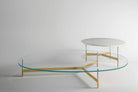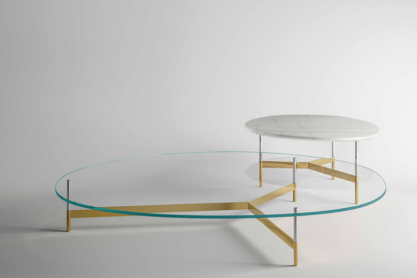 Collection of low tables and side tables, minimalistic metal structure with contrasting finishing. Available in different dimensions and heights, top of organic shape made in glass, wood and marble. The great range of finishing and forms allows dynamic and original combinations and aggregations. The marble and wood tops are embellished by an exclusive bevelling of the edges, creating harmony between the materials and forms. The upper metal support, always in stainless steel, communicates with the different finishes of the lower frame, creating unusual compositions. Metal structure with upper support, available only in stainless steel, frame and lower support available in chrome, gold, cupper, gunmetal, polished or brushed. Top in glass extra clear, smoked or bronze, in wood Siberian Ash or Eucalipto, marble Arabescato Orobico Gold, Tropikal Storm or Domus White.