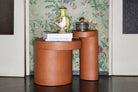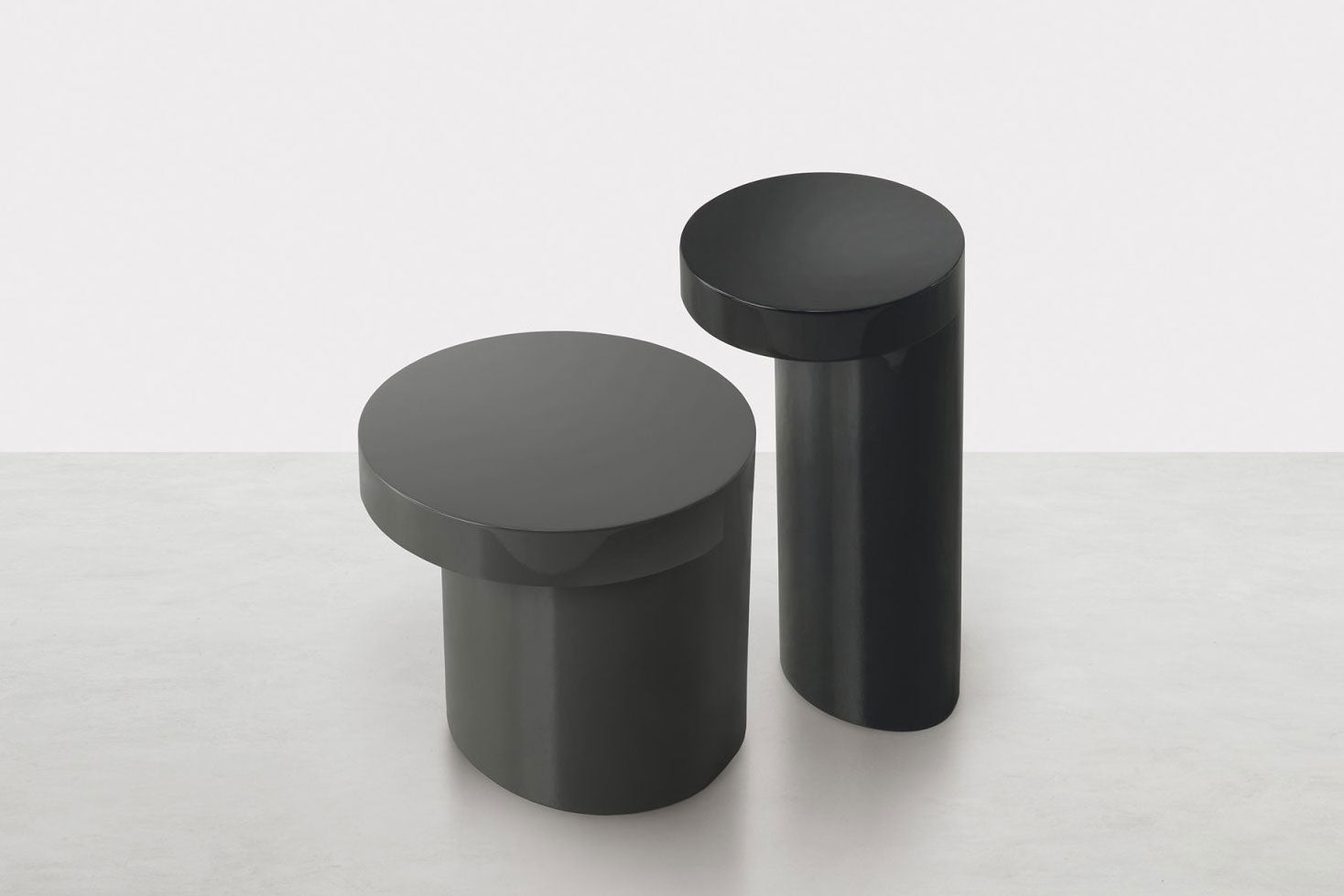 The exaggerated volumes of Lazy-O are the mantra of a series that includes a console table, side tables, and a bench.