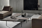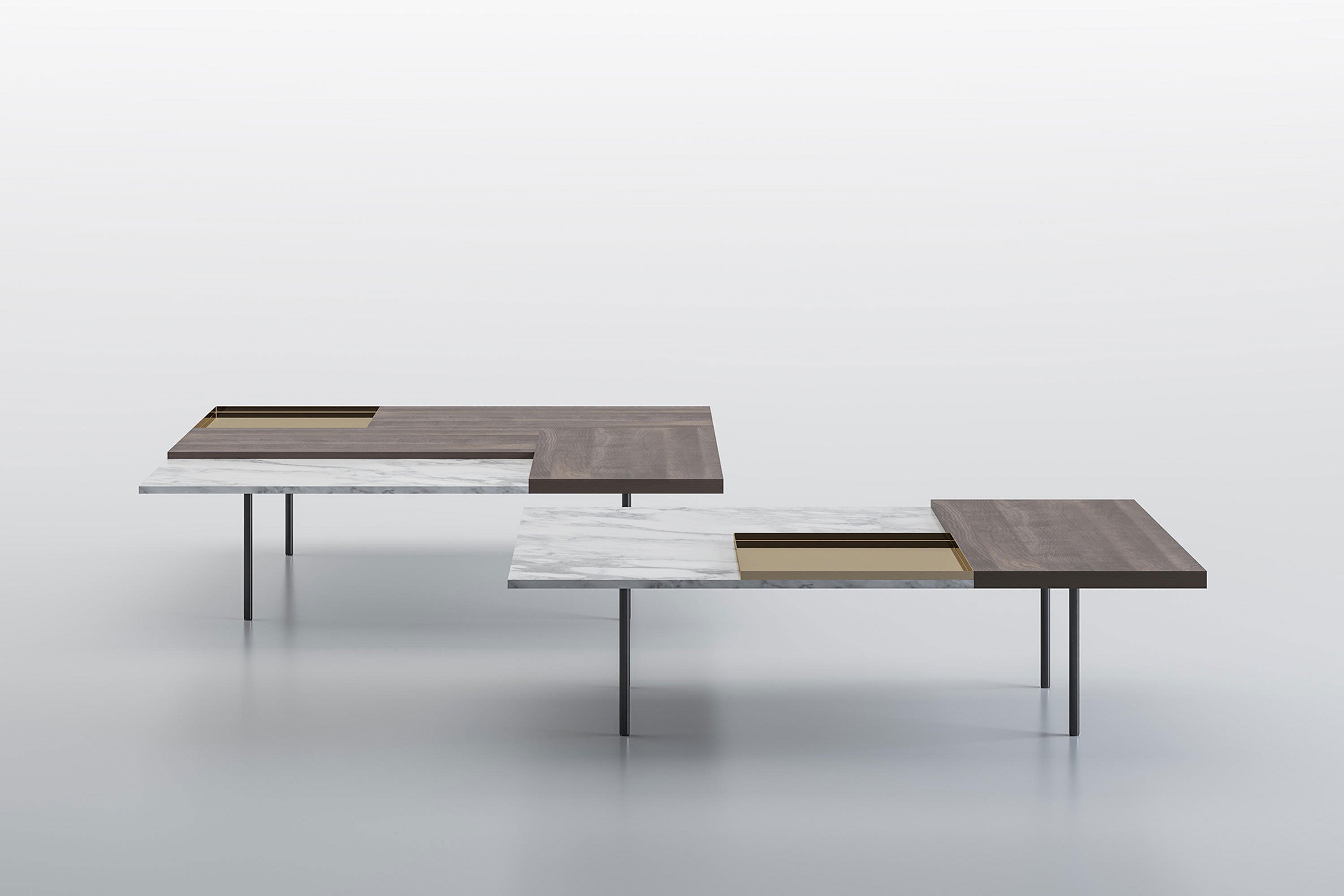 For his first designs for Acerbis, Massimo Mariani applied the materially-focused approach that won him the Compasso d’Oro to create a truly exceptional line of versatile coffee tables of mixed and contrasting materials. Also available as sideboards, the Moodboard collection is a line of low tables in various sizes and shapes, with tops in a mix of wood, marble, polished steel, and brass, creating a mosaic of materials, colors, and textures. Easy to combine to create larger islands of tables for bigger groups, a polished steel or brass tray can be added as a valet or utility tray, which also functions as an integral part of the design and structure when not in use.
