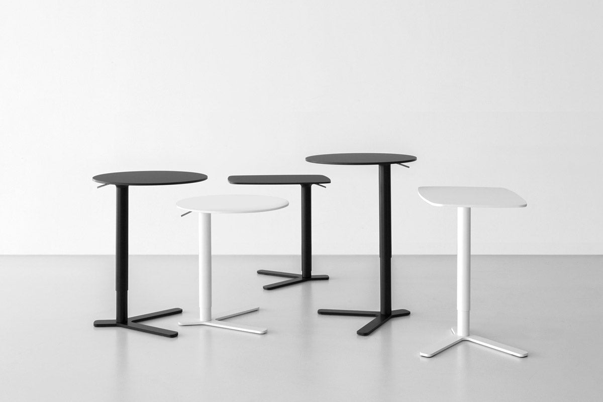 Recalling the sign of victory, the YO table is successful thanks to its versatility, meeting all needs as a top in work and relaxation spaces. Thanks to its off-centre base and its Y-shaped leg, the tabletop, available in various geometric shapes, perfectly aligns with armchairs and sofas. Height-adjustable, it is as handy as a small desk.