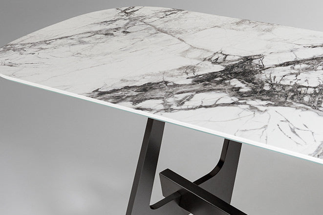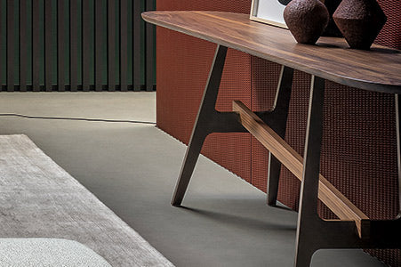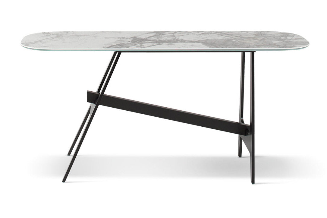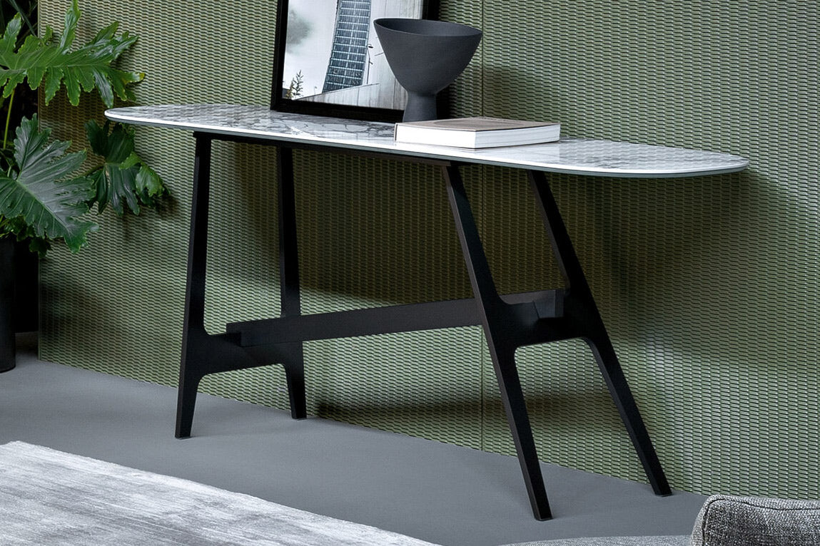 For this collection, designer Giuseppe Viganò draws inspiration from the world of geometry, from which he borrows different shapes and harmonizes them in a single design. The collection plays with minimal shapes articulated in space: the horizontal top is supported by two stands with a characteristic H shape, one vertical and one slanted, united by a transverse element that conveys a sensation of movement. The legs and central stem are made of metal, while the top with rounded corners is available in numerous finishes, from wood to ceramic, marble, and crystal, creating combinations of materials that are always different and can respond to any furnishing and style requirement.
