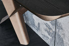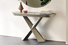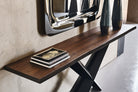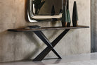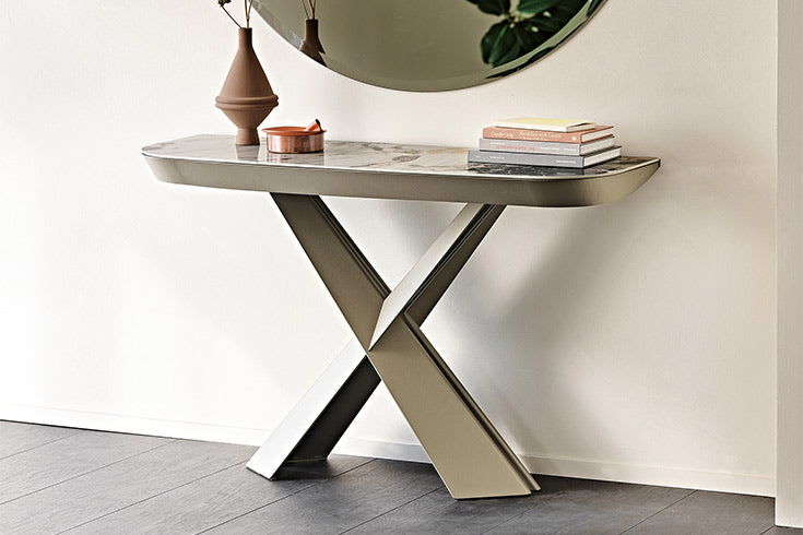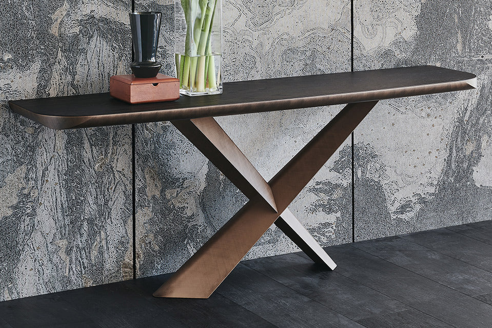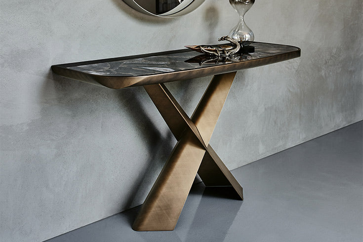 The Terminal design consoles are suitable for different spaces and living needs. They can be placed as hallway furniture, or in any room of the house as a functional yet decorative piece of furniture. Terminal consoles stand out for their finely selected design, quality and range of raw materials. The collection includes two lines of modern wooden consoles: with burnt or natural oak top and irregular edges in solid wood and the Wood-c version in Canaletto walnut or matte black open-pore dyed Elm with rounded varnished lower profile, respectively Brushed Grey or Brushed Bronze. Terminal Keramik Premium and Terminal Keramik Drive are a tribute to the marble top console, available in many exclusive shades. The first is enhanced by the elegant Brushed Bronze or Brushed Grey frame. While the second is an extendable console table that reaches 2 metres in length thanks to an ingenious mechanism of extensions and supports, turning into a magnificent table ready to welcome guests.