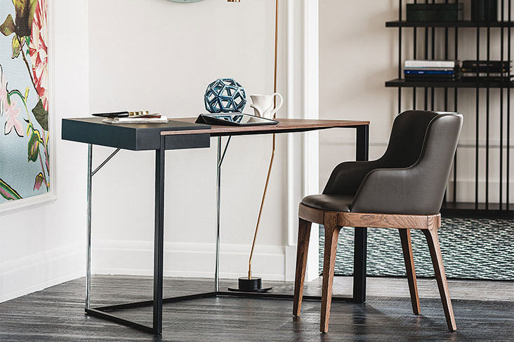 Clarion Desk by Cattelan Italia, designed by Andrea Lucatello features a drawer set within a frame varnished with epoxy powders in white, graphite or black embossed lacquered steel and chromed stainless steel. Top in lacquered white, black or graphite embossed MDF and Canaletto walnut or burned oak veneered. Suitable only for indoor use.