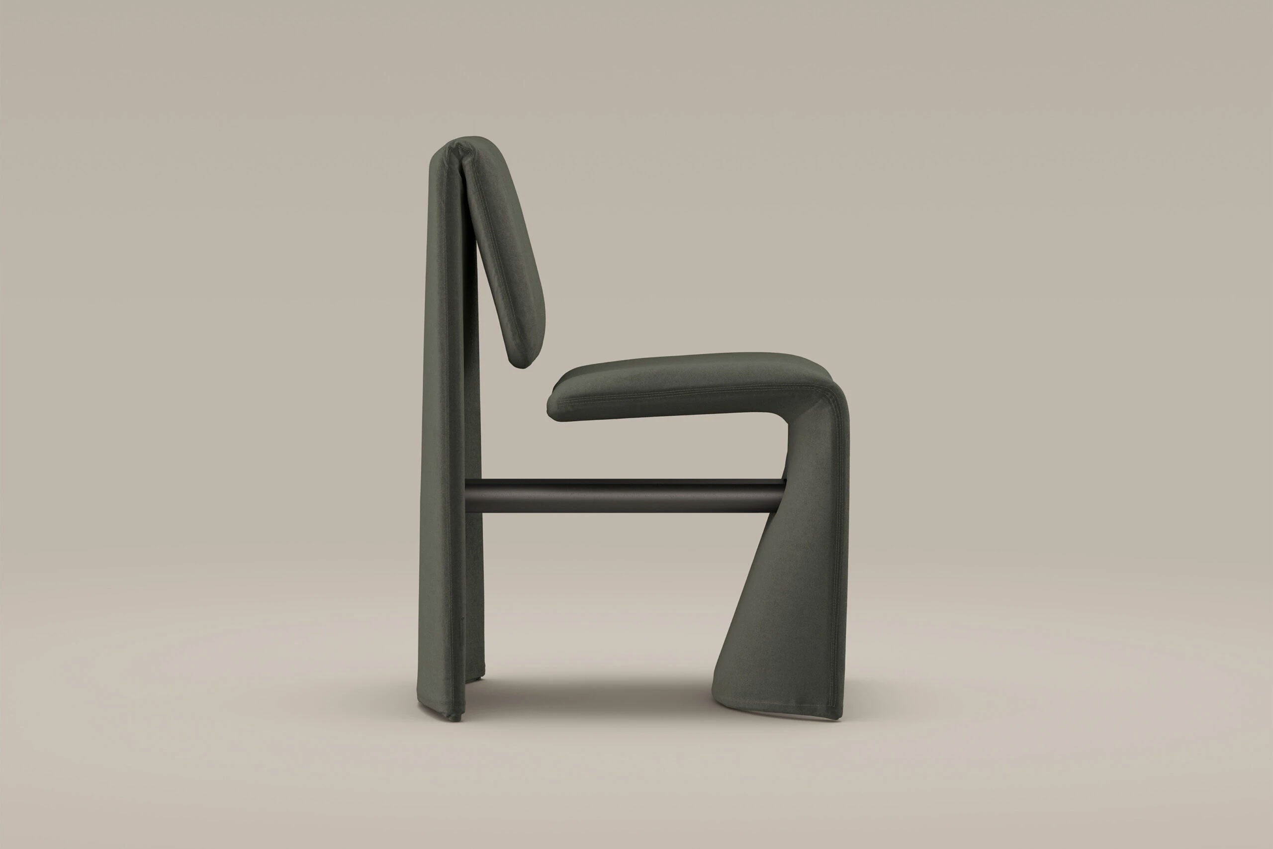 Its seat and backrest are formed from two gently curved elements, connected by a slim metal tube that creates a sense of suspension and balance.