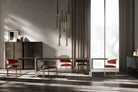 Cosmo is characterised by the combination of flat elements placed together to form a composition of great formal simplicity and, at the same time, rigorous elegance. The wood and marble elements, juxtaposed with each other in different sizes and thicknesses, give life to horizontal and vertical geometries in which the detail of the overlaps and mismatches creates timeless tables, desks and consoles.