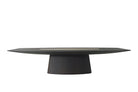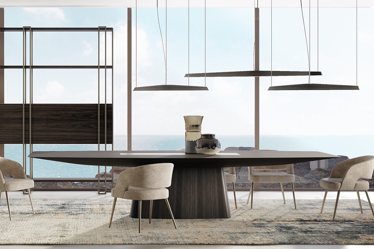 Evan is an extremely unusual and slender table, characterised by taut lines that meet soft and pleasant volumes. With its modern shape, it consists of a monolithic central base and a top embellished with a metal insert on its surface.