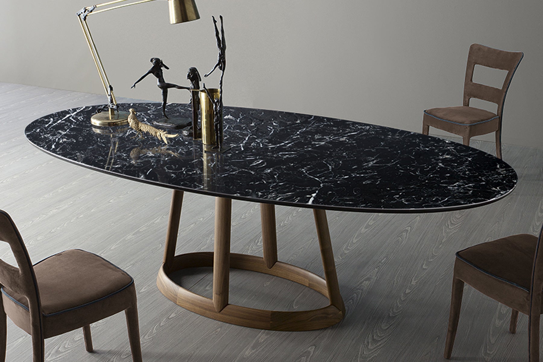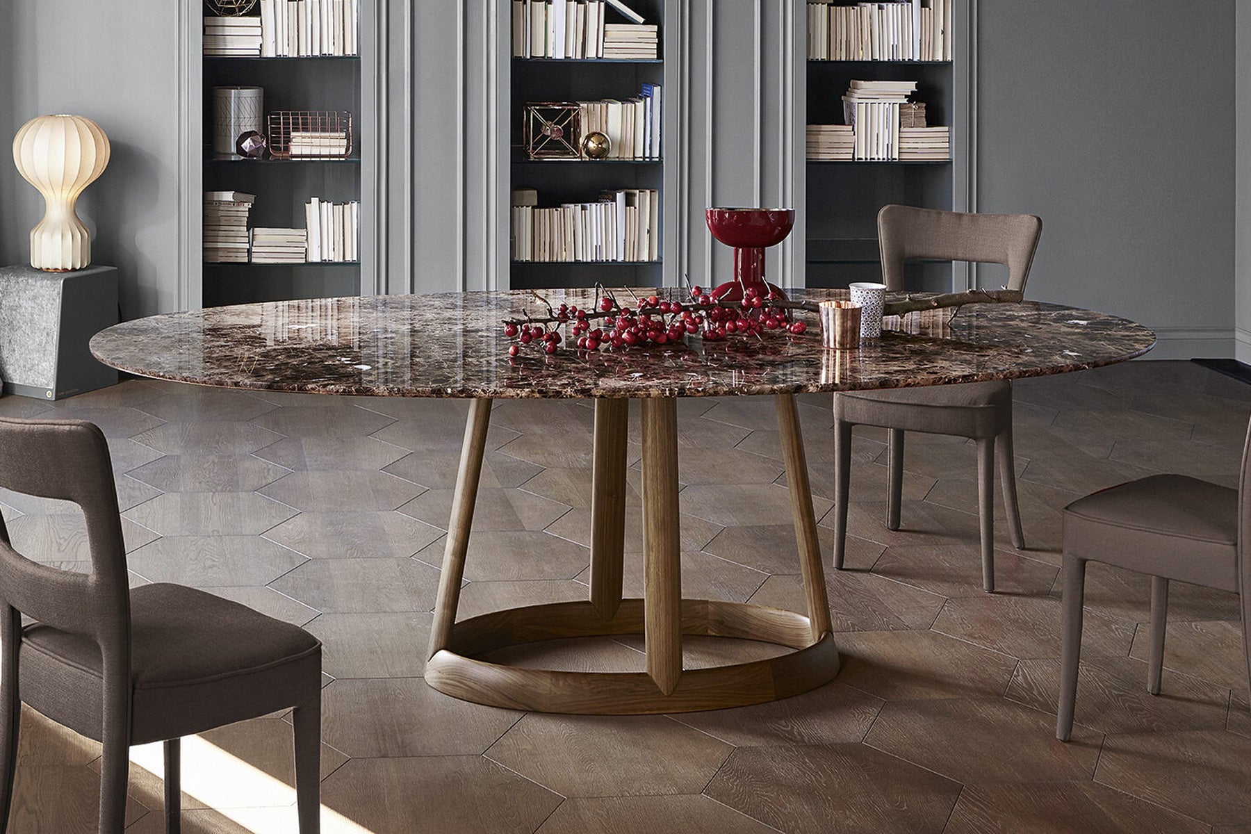 Marked by harmonious elegance, this fixed table combines a solid wooden base, available in three different finishes (American walnut and natural or coal ash), with an oval or round top made with different finishes in marble, glass or ceramic.
