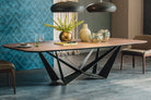 The Skorpio Table comes with a transparent varnished metal base in options of orange fluo, white, black or graphite embossed lacquered steel with tabletop choices in glass or solid wood. Wood finishes in Heritage Oak, Canaletto Walnut, Burned Oak, or Natural Oak. Glass options in clear or extra clear glass with reversed beveled edges. The top rests on the base. Available in a round and rectangular versions in multiple sizes and special tops sizes can be made to order.