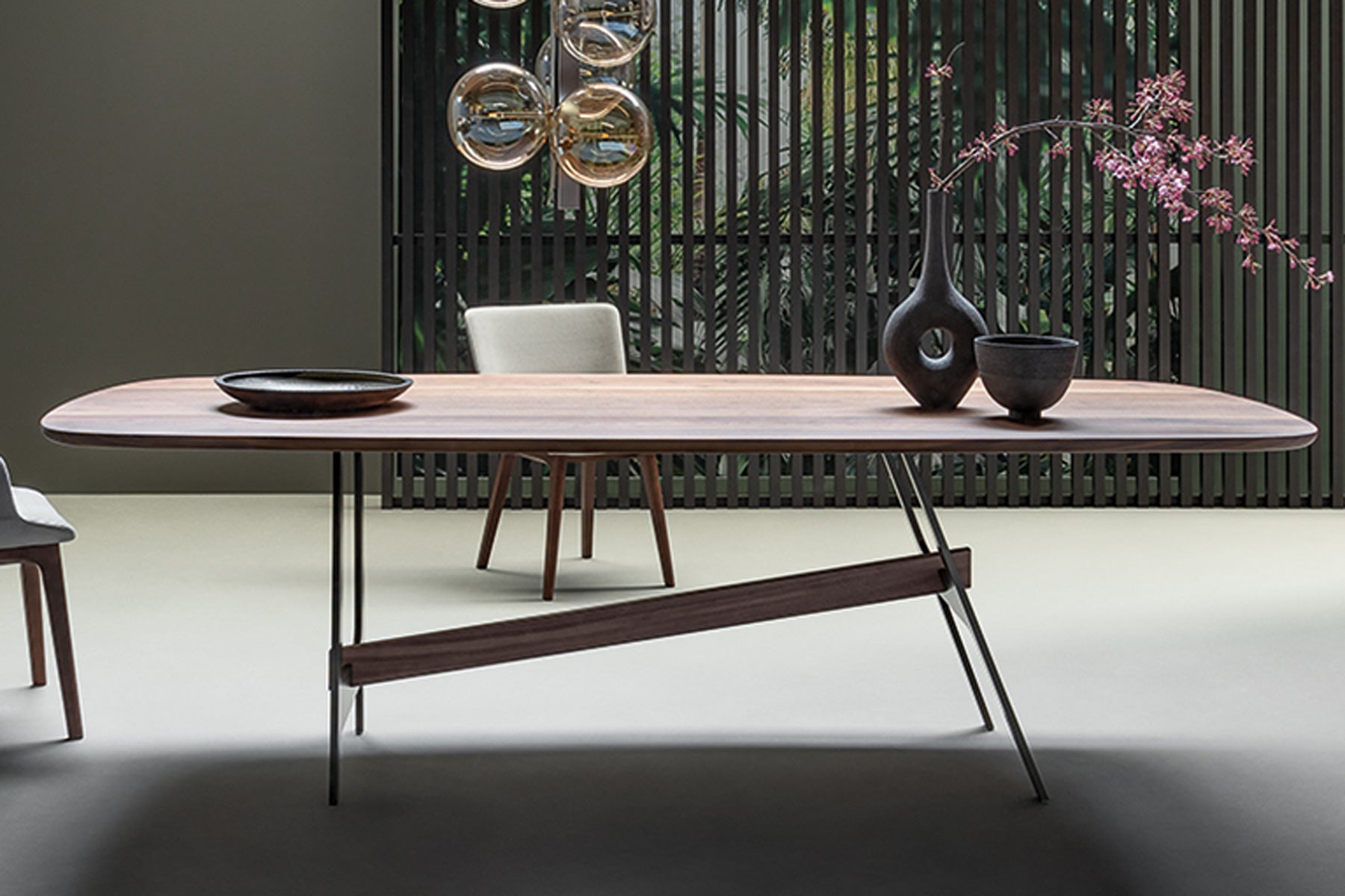The legs and central stem are made of metal, while the top with rounded corners is available in numerous finishes, from wood to ceramic, marble and crystal, creating combinations of materials that are always different and can respond to any furnishing and style requirement.