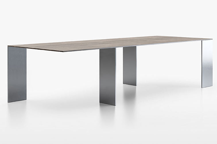 The table, with an extra-thin top, is made of composite material veneered with precious woods, or in back-lacquered glass. The top is supported by four legs in reflective polished stainless or brushed burnished steel, and placed onto opposite perpendicular axes.