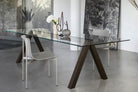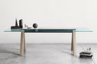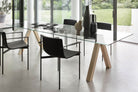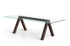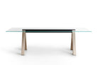 Another uniqueness is achieved by the juxtaposition of the materials: the extra-light glass top, also available in wood, in argilla and reconstructed marmo finishes, exclusive to Lema and in porcelain stoneware; the wooden legs and the support in metal