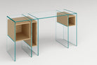 Marcell represents a timeless classic, defined by the essential and rigorous lines of the glass and the warmth and texture of the wood. Great versatility for its use in different areas, Marcell is born as a desk but finds its place also as an entry console and, if equipped with glove box drawers and countertop mirror, as a dressing table, thus becoming the protagonist of the night area. Console, desk or dressing table with structure in glued glass extra clear or smoked and wooden storage units in Eucalipto, Siberian Ash or Natural Oak. Optional hinge door left or set of 3 drawers in matching finish. The desk can be completed with the countertop mirror of the same collection with polished chrome metal base.