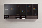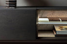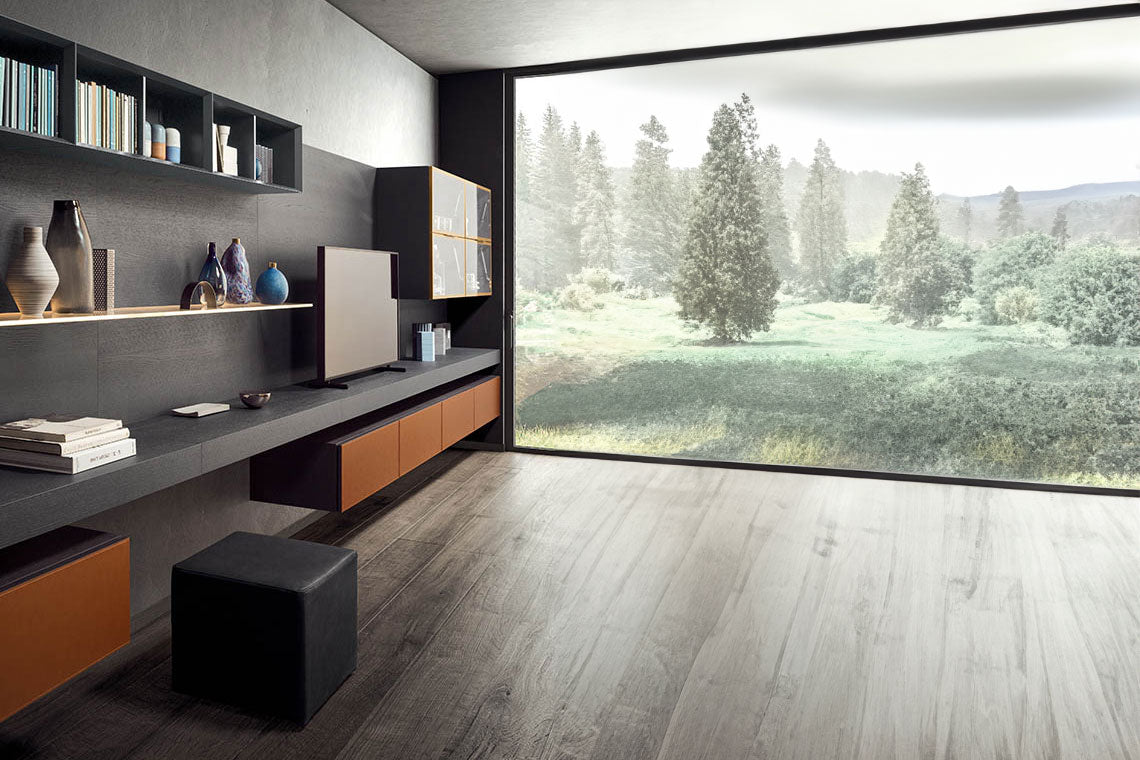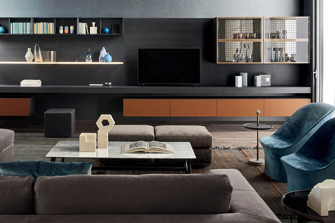 Geometric design meets sophisticated detail. Elegance is the key to rediscovering the beauty of everyday living. The modular People system is the perfect solution for those who love to see their ideas take shape, customizing their home interiors with freedom and refined beauty. The mitre-folding carcass and absence of handles create a flowing, subtle design, with contrasting luxurious accent details, like the spacer elements, backlit glass shelves, new hard leather fronts and back panels in materico marble.