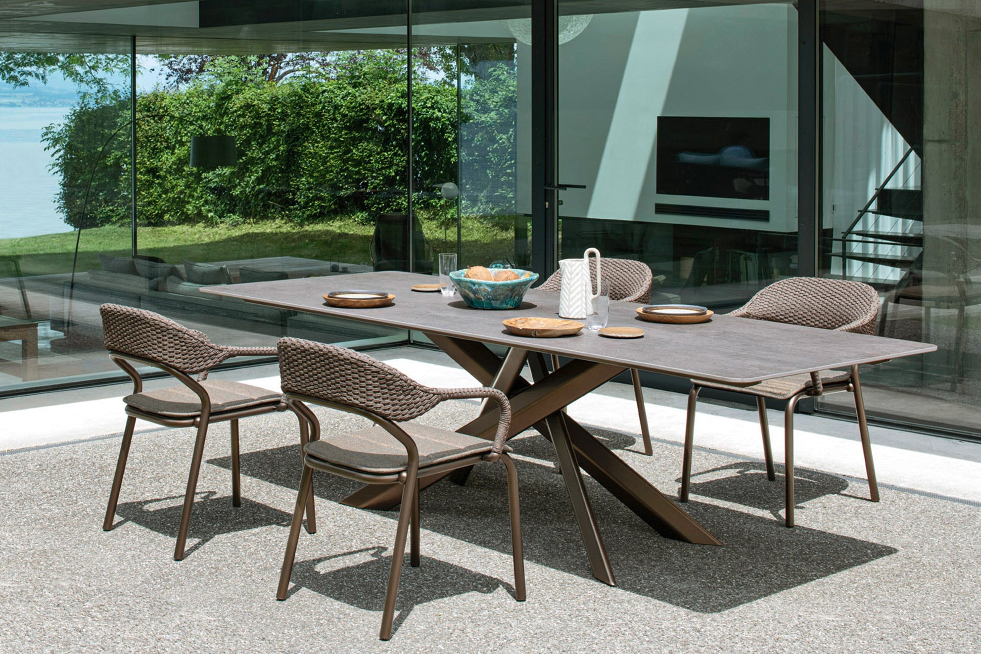 The maxi and maxi long System Star tables let you enjoy conviviality. The large top is placed on two elliptical bases, whose legs intertwine in a play of lines like a star, the characteristic motif of the entire System Star collection. Elegance and personality, to furnish with style the outdoor dining areas of residential and contract environments. The strong personality of the System Star table gives elegance and style to the outdoor spaces it furnishes and finds full expression in both residential and contract settings.