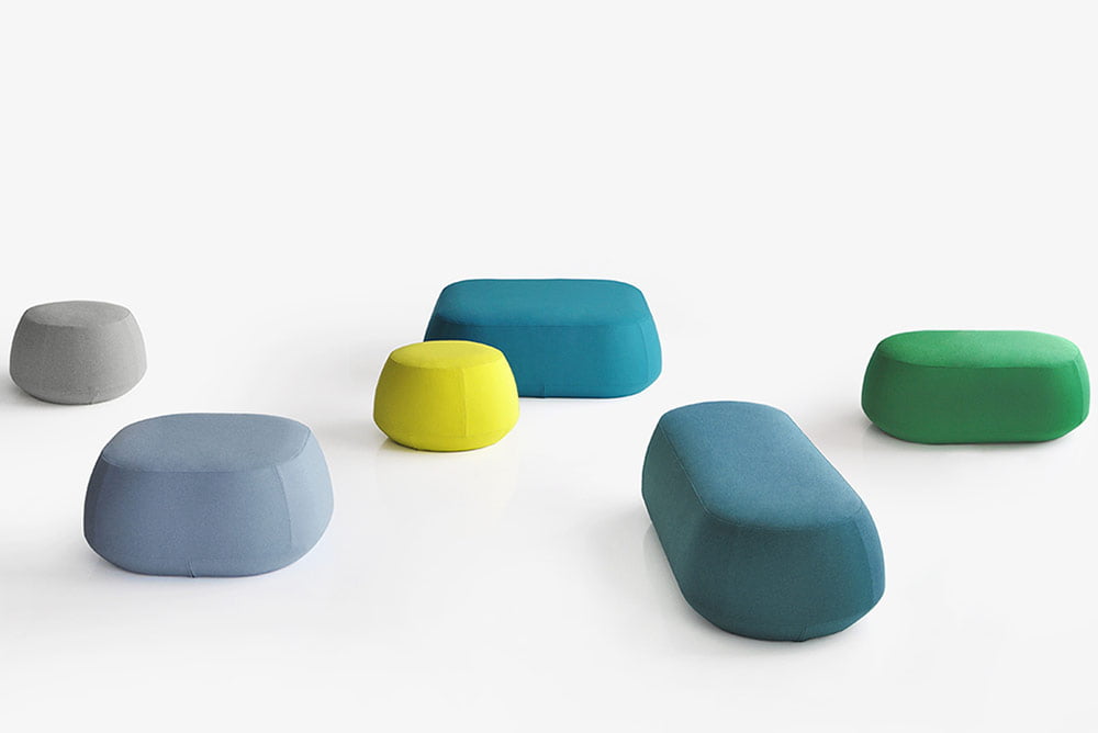 The Ile series of ottomans share the same undercut prominent on the U Turn lounge chair. This detail is not only a visual feature that lightens the look of the piece it also provides foot space making sitting down and standing up much easier. The Ile series come in several different shapes and sizes and feature a light core construction capped with layers of engineered foam. Covers are attached by Velcro and are removable for easy cleaning or replacement.