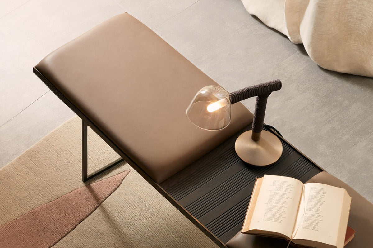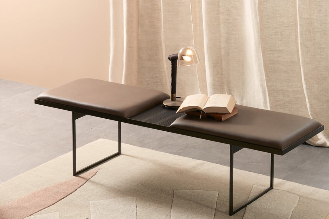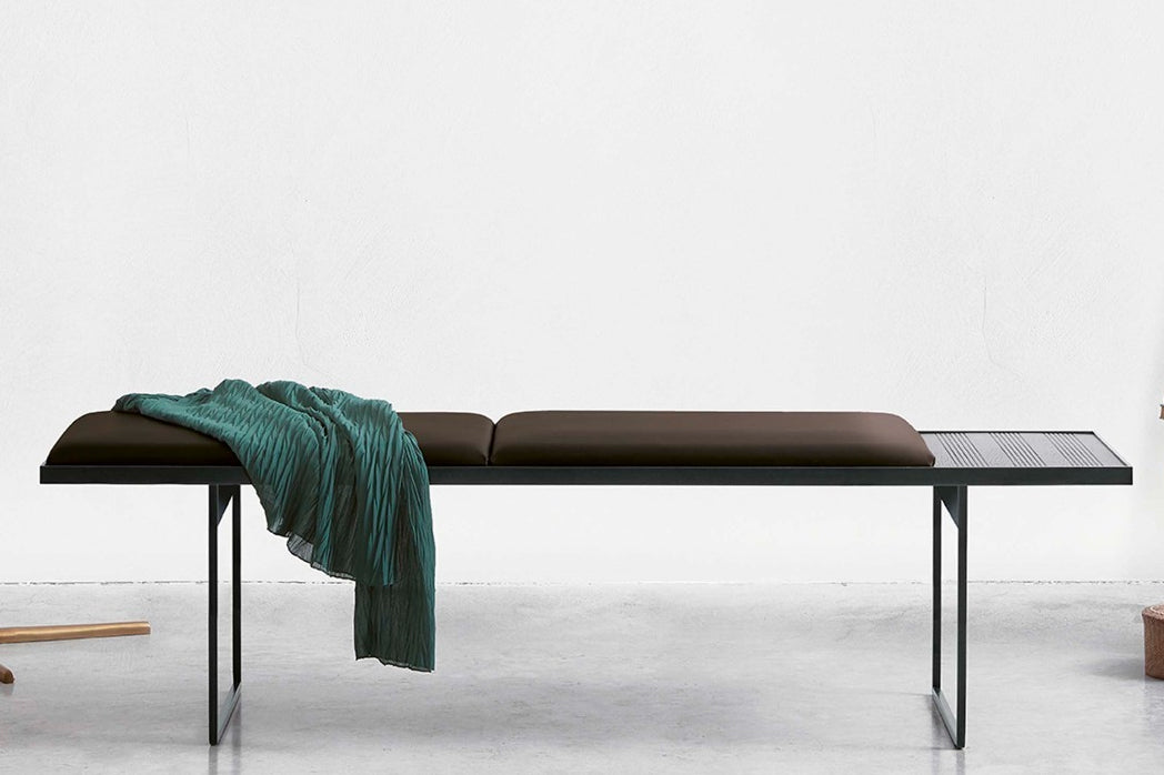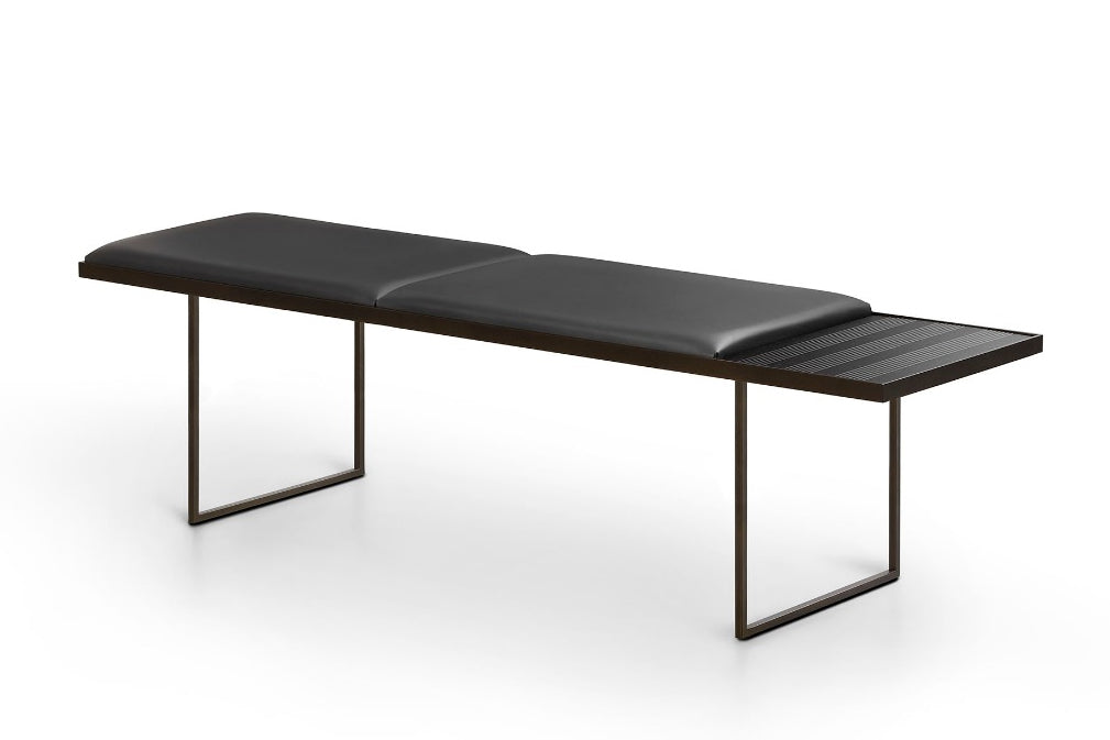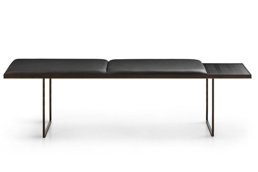An elegant object in its discreet aesthetics and innate versatility, Uma gives lightness to the domestic space: perfect whether placed in the bedroom, the living room or the entrance. The sophisticated character is identified in the simplicity of the lines and of their movement emphasised by the combination of different materials: the double structure in bronze painted metal that welcomes the padded seat with double cushion in leather or eco-leather which is flanked by a part left free, at the side or centrally, where there is a heat-treated oak tray integrated into the frame, with millerighe inserts, designed as a container for small objects.