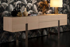 Gala stands out for its great sobriety and for the lightness that its proportions convey. An important, monolithic-looking storage unit is suspended on a banded metal frame that embellishes the cabinet. Equipped with doors or drawers, Gala is a versatile and refined piece of furniture.