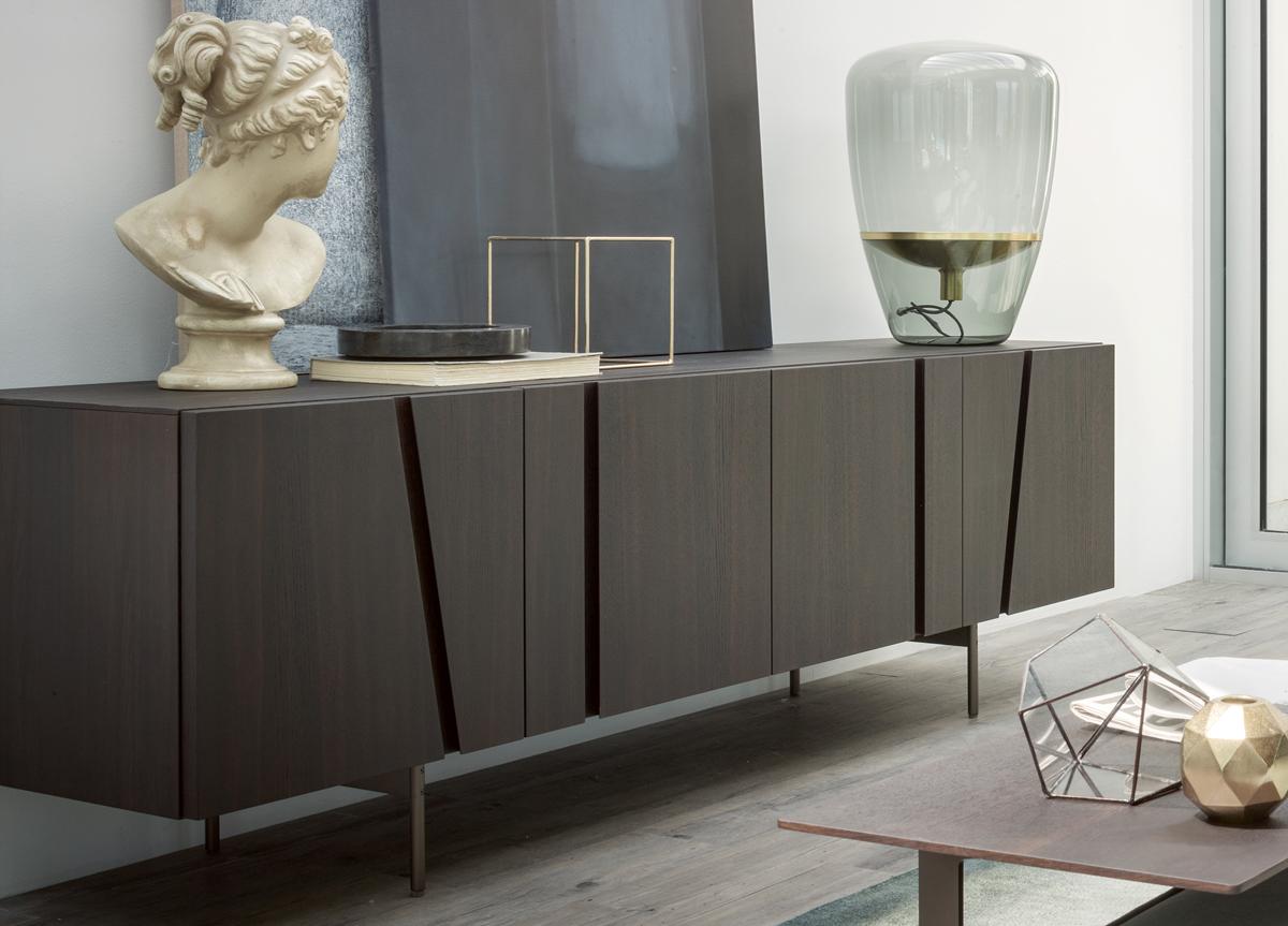 Seventies inspiration for the four-door sideboard in thermo-treated oak and matte lacquered Picture, a project with an extremely simple design in the drawing of its volumes supported by the metal base, yet able to transform into a design piece with a strong personality thanks to the surfaces of the doors engraved as if they were a bas-relief that gives an abstract effect of shadows.
