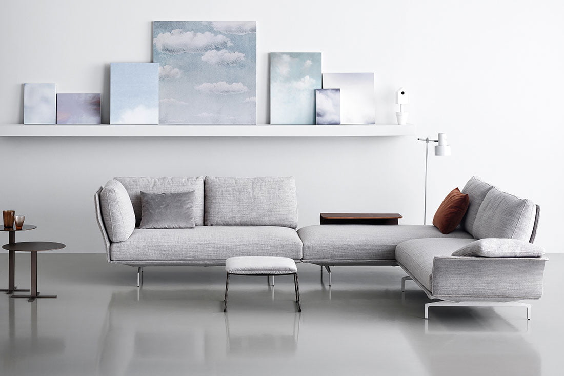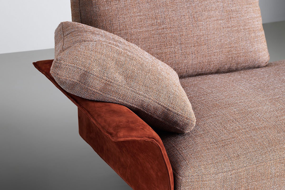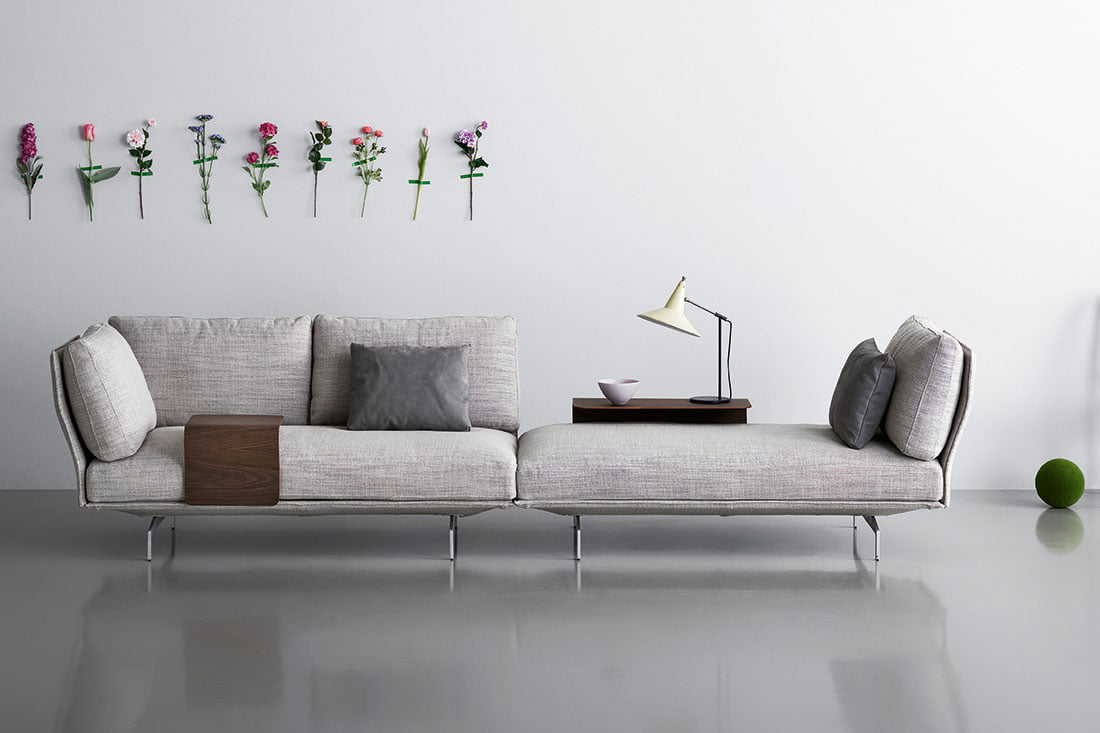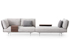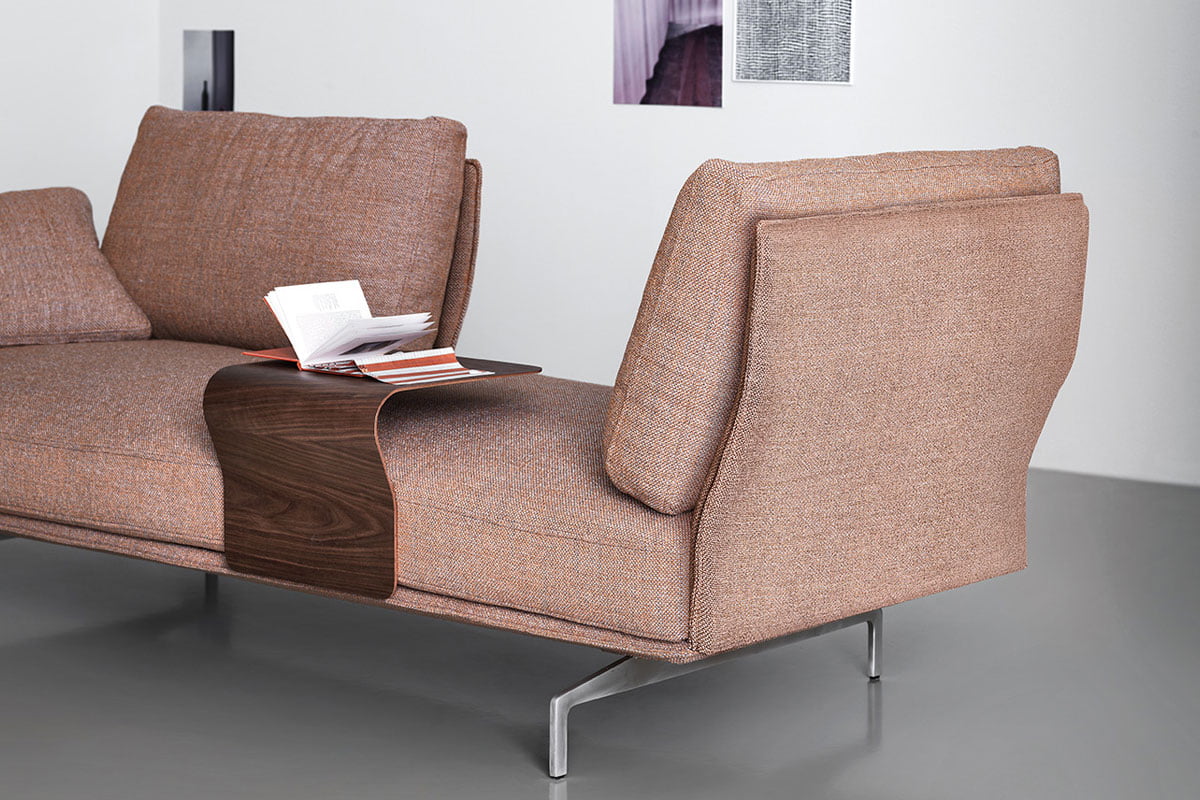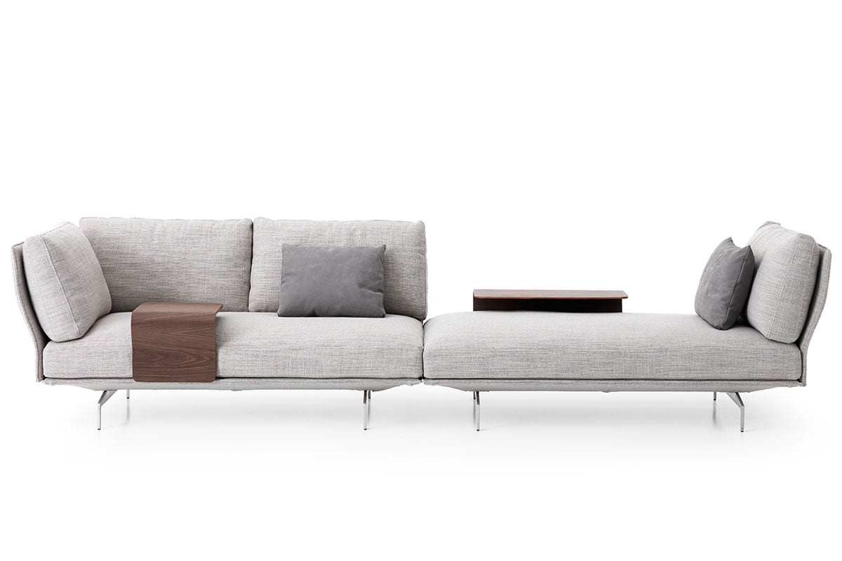 Flow, adapt, create void, rearrange space, receive and renew indefinitely. The new Avant-Après seating is able to do it all. Rigid yet lightweight, the sofa comes in fascinating configurations thanks to the special and unique armrest/backrest system that detaches with a simple movement and may be positioned all along the base. A pre-and-post dance that can be staged every day, created by the desire to try something new. Avant-Après has a sober allure and an elegant appearance. The seating is placed on a metal base upholstered in fabric or leather, resting on metal feet. Refined accessories complete the system: the side tables are walnut wood and come in two different sizes, with the warm notes of the wood. Fully removable covers.