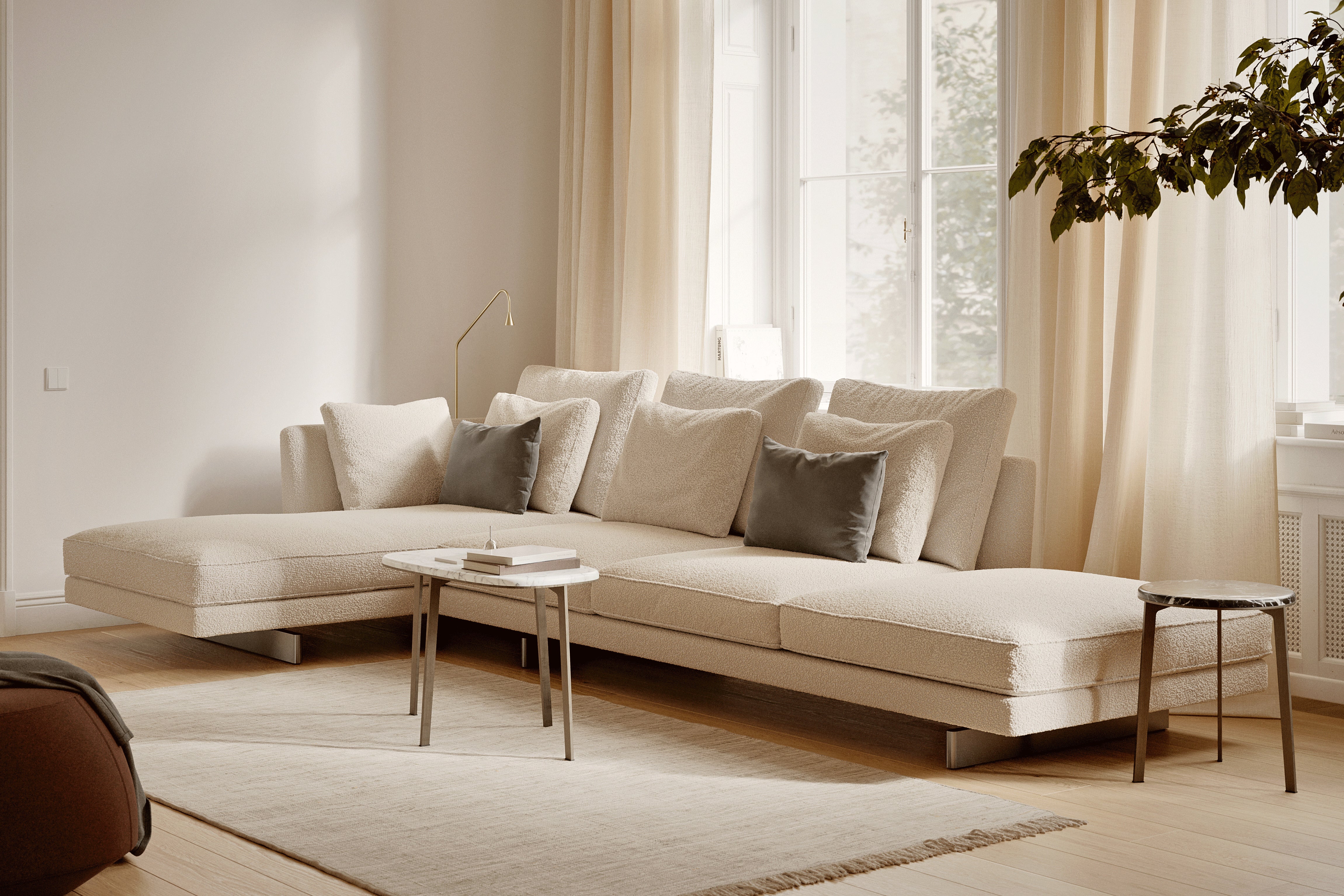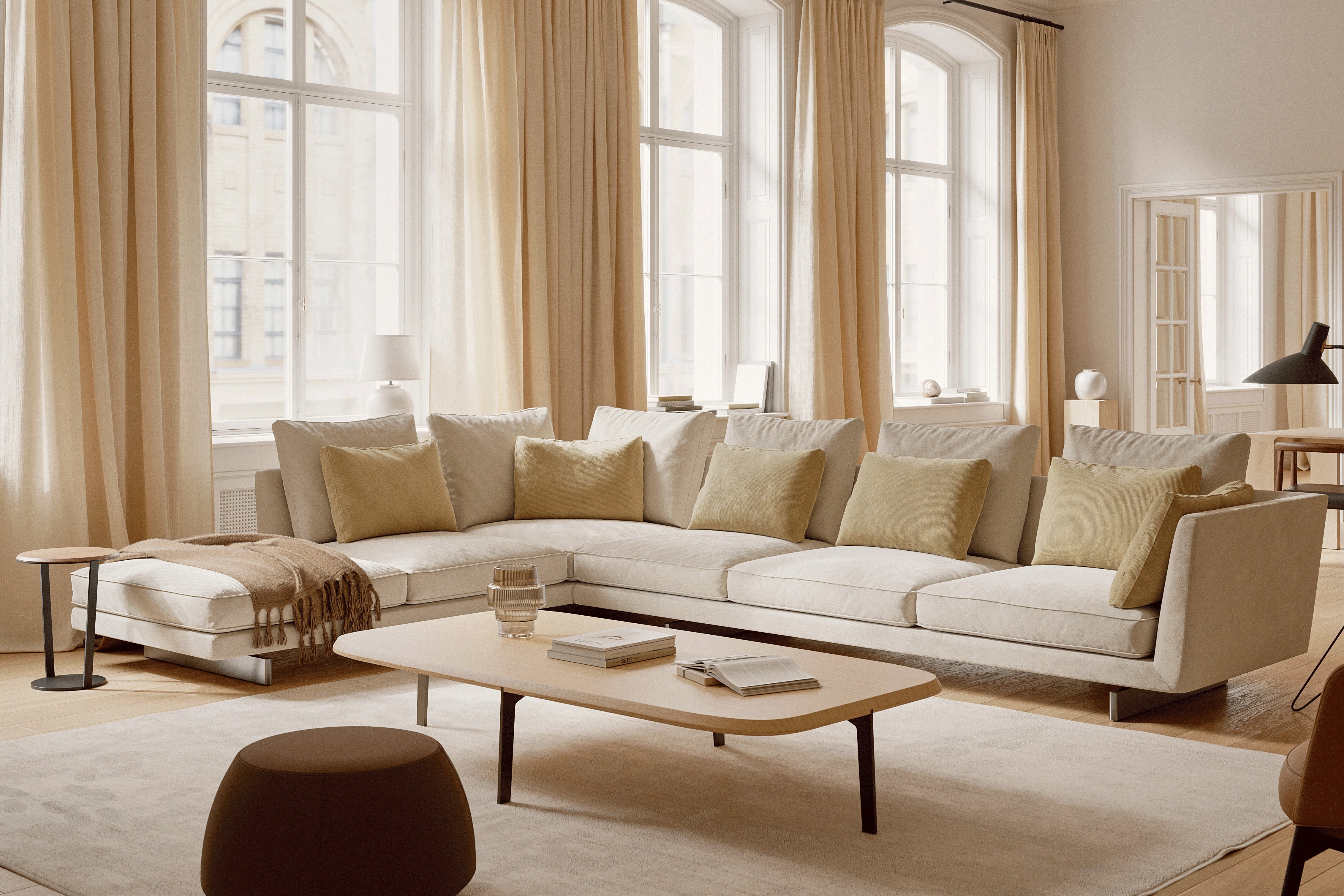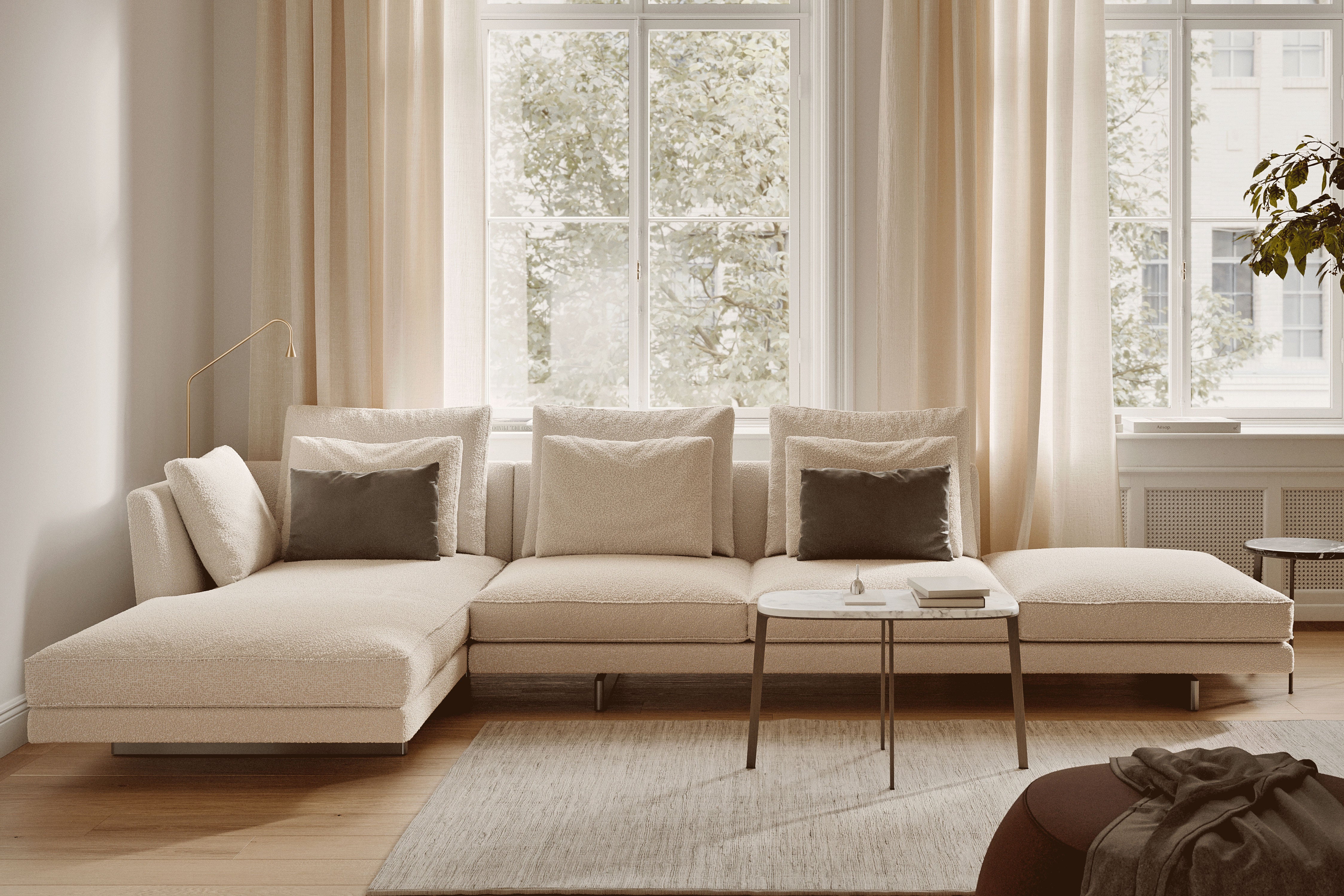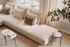 Premium engineering underpins its soft, architectural look: a wood panel frame with multi-density foam, down-feather cushions, and removable upholstery options in high-quality fabric or leather.