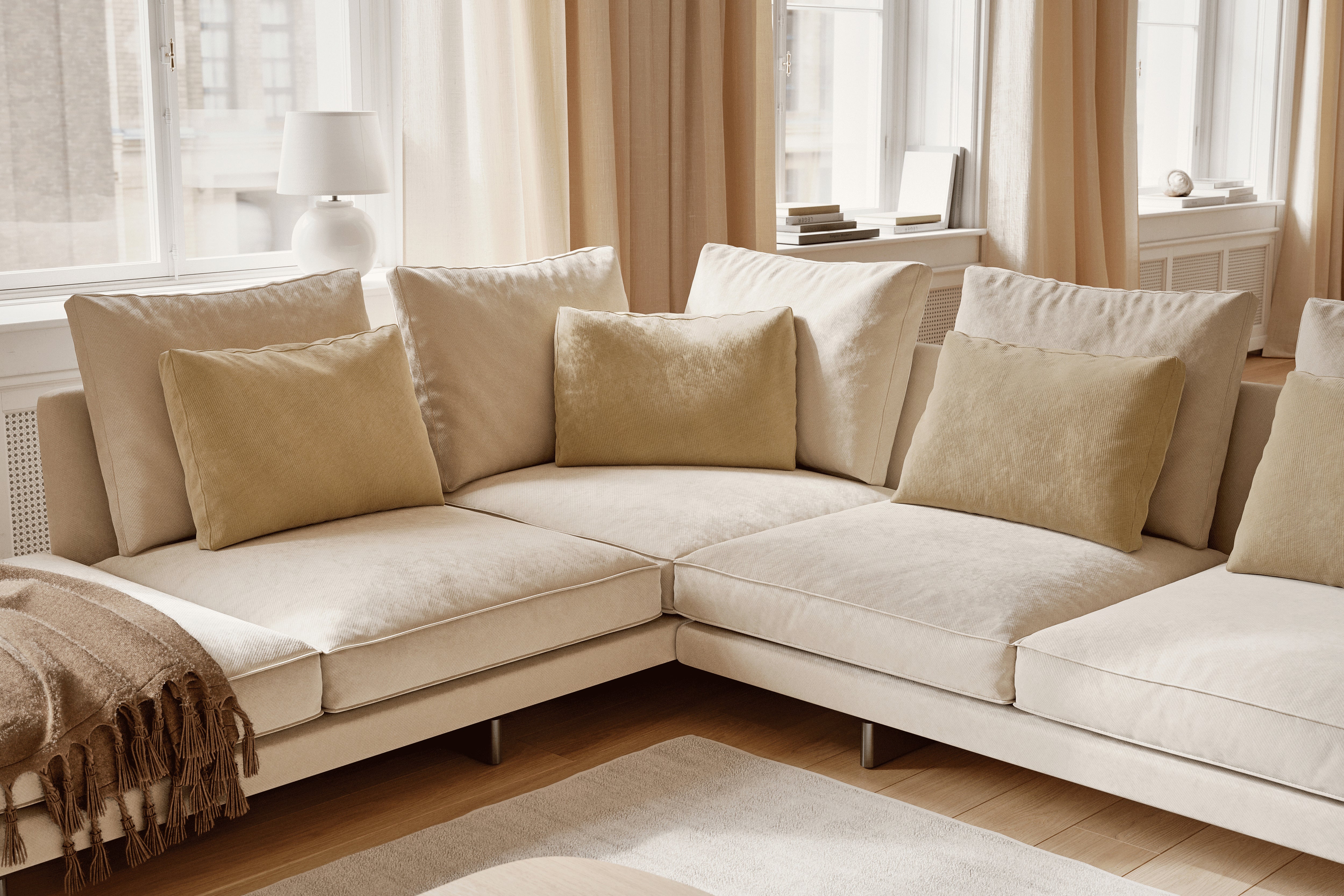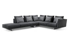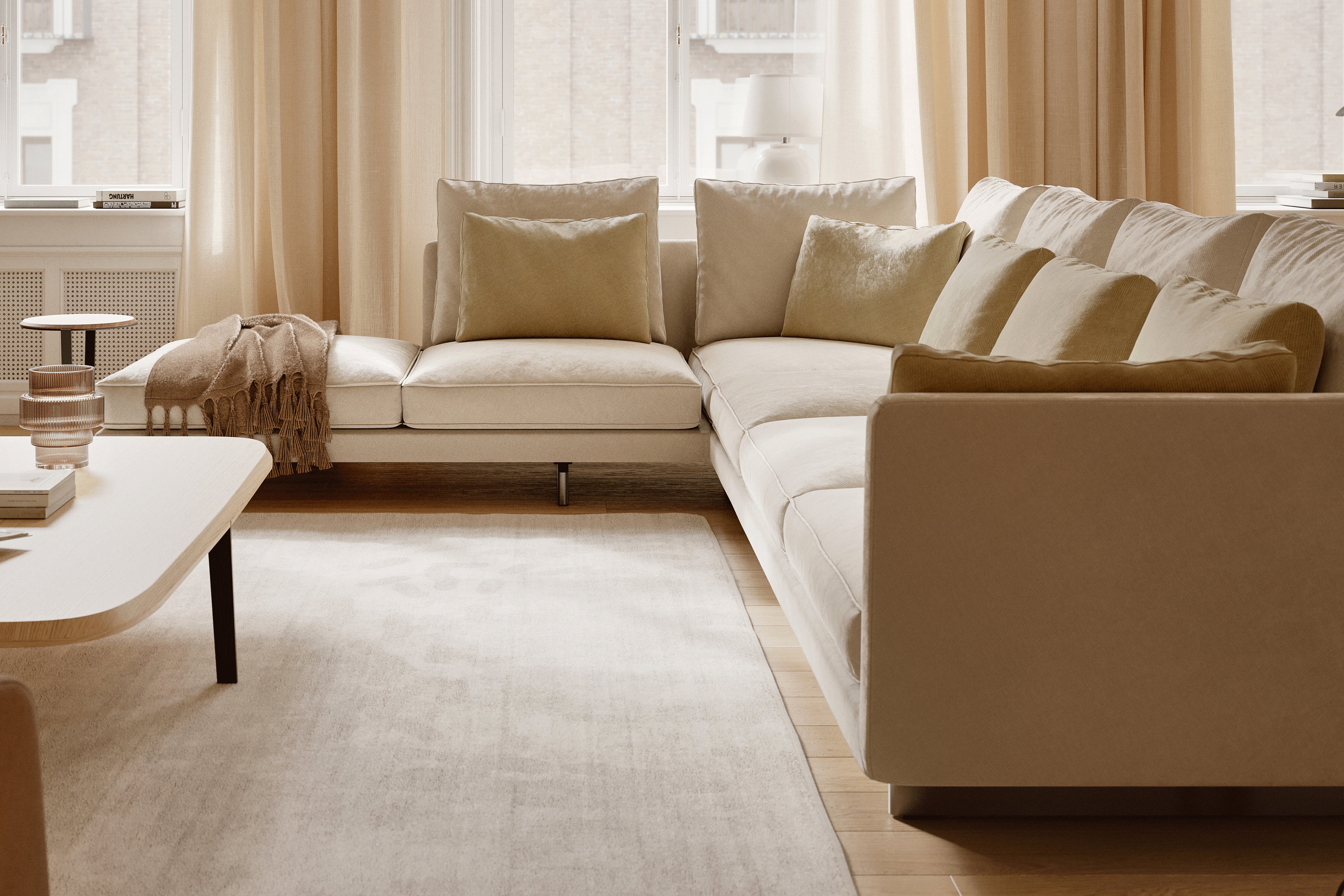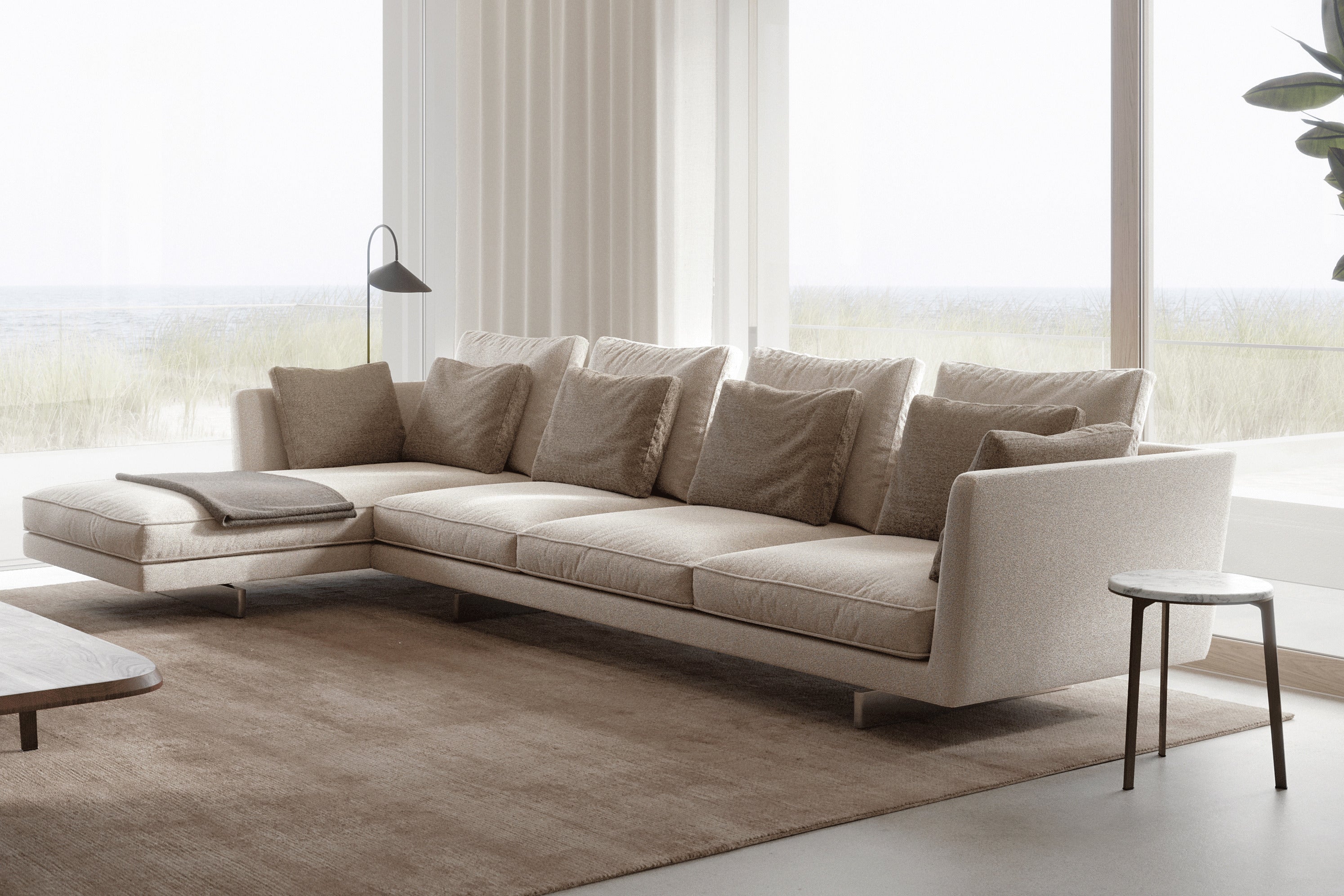 Premium engineering underpins its soft, architectural look: a wood panel frame with multi-density foam, down-feather cushions, and removable upholstery options in high-quality fabric or leather.