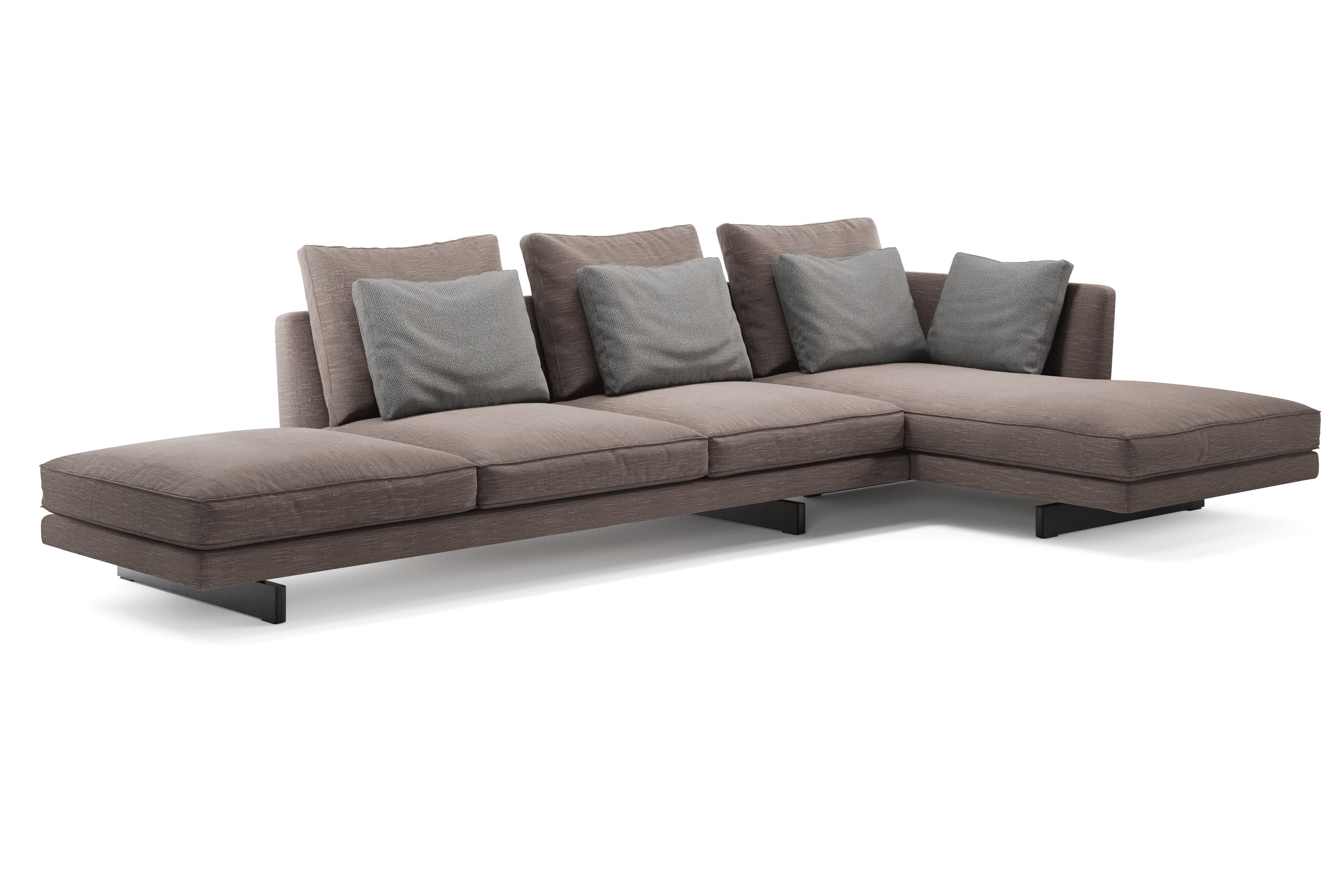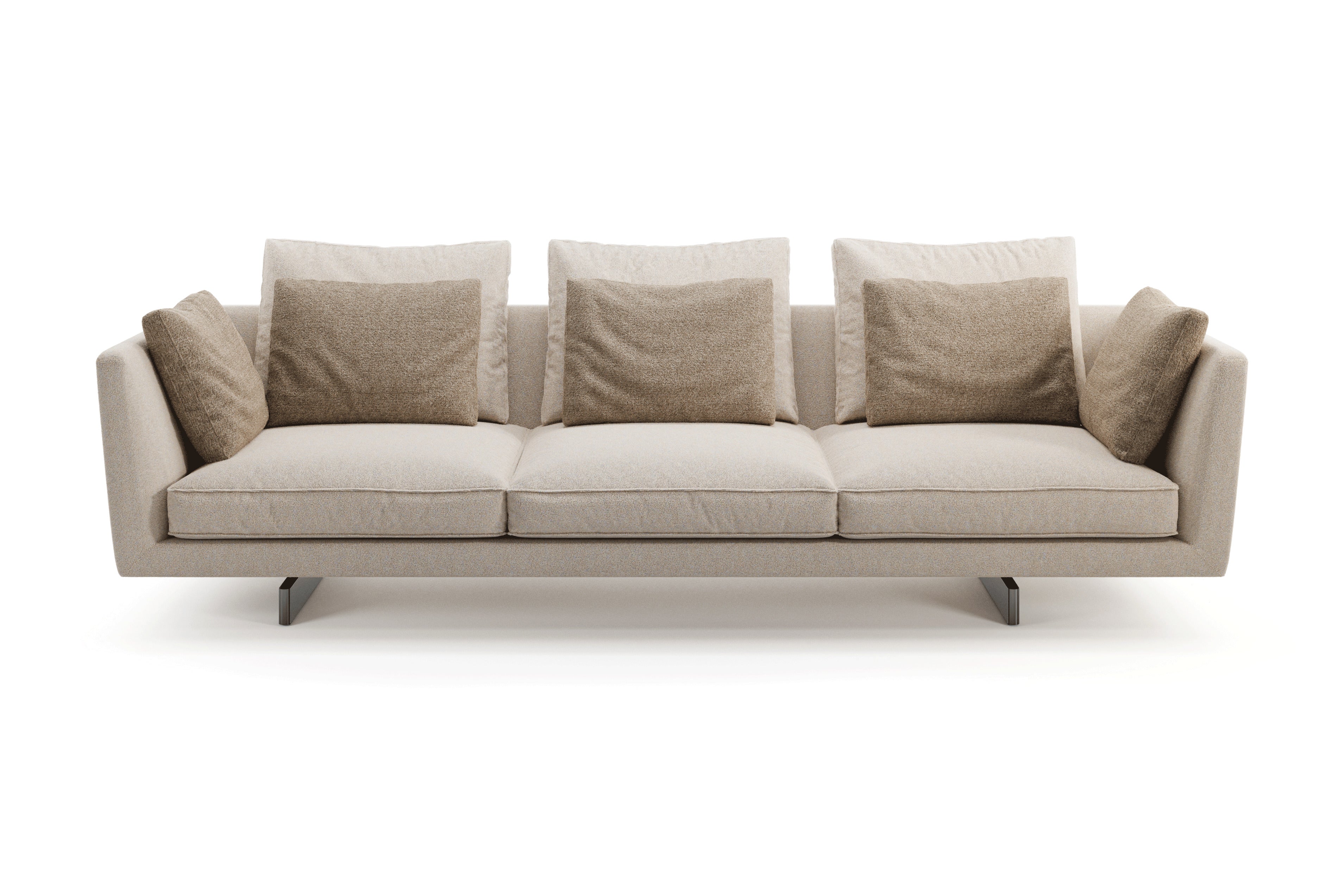 Resting on slim parallel legs, its tapered backrest supports generous feather-filled cushions that invite you to lounge deeply.