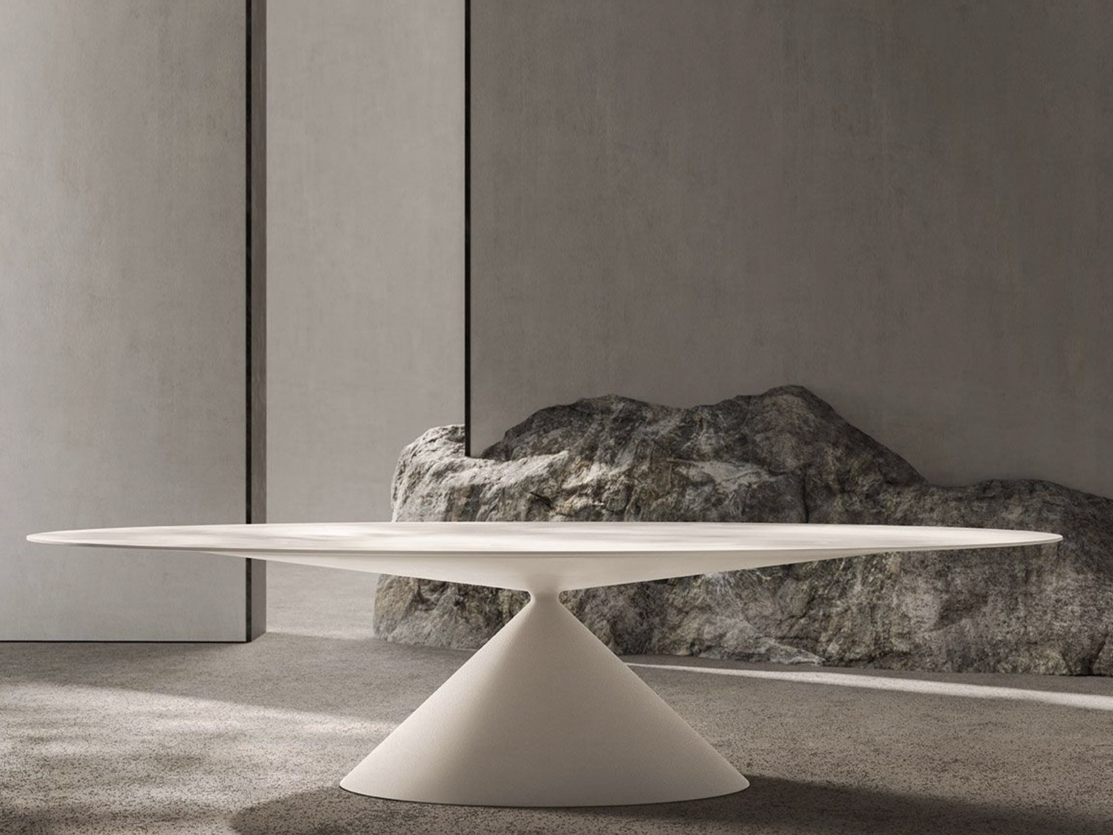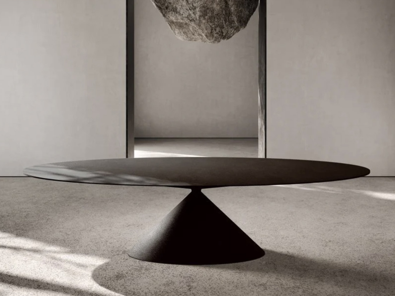 Clay is a table-sculpture born from the meeting of two volumes:the top and the base, balanced one on the other, experience the bold support of a section reduced to a minimum. The Clay table, where the pleasant combination of geometric volumes creates an essential yet special product. Here it is in oval version, with elliptical base and top.