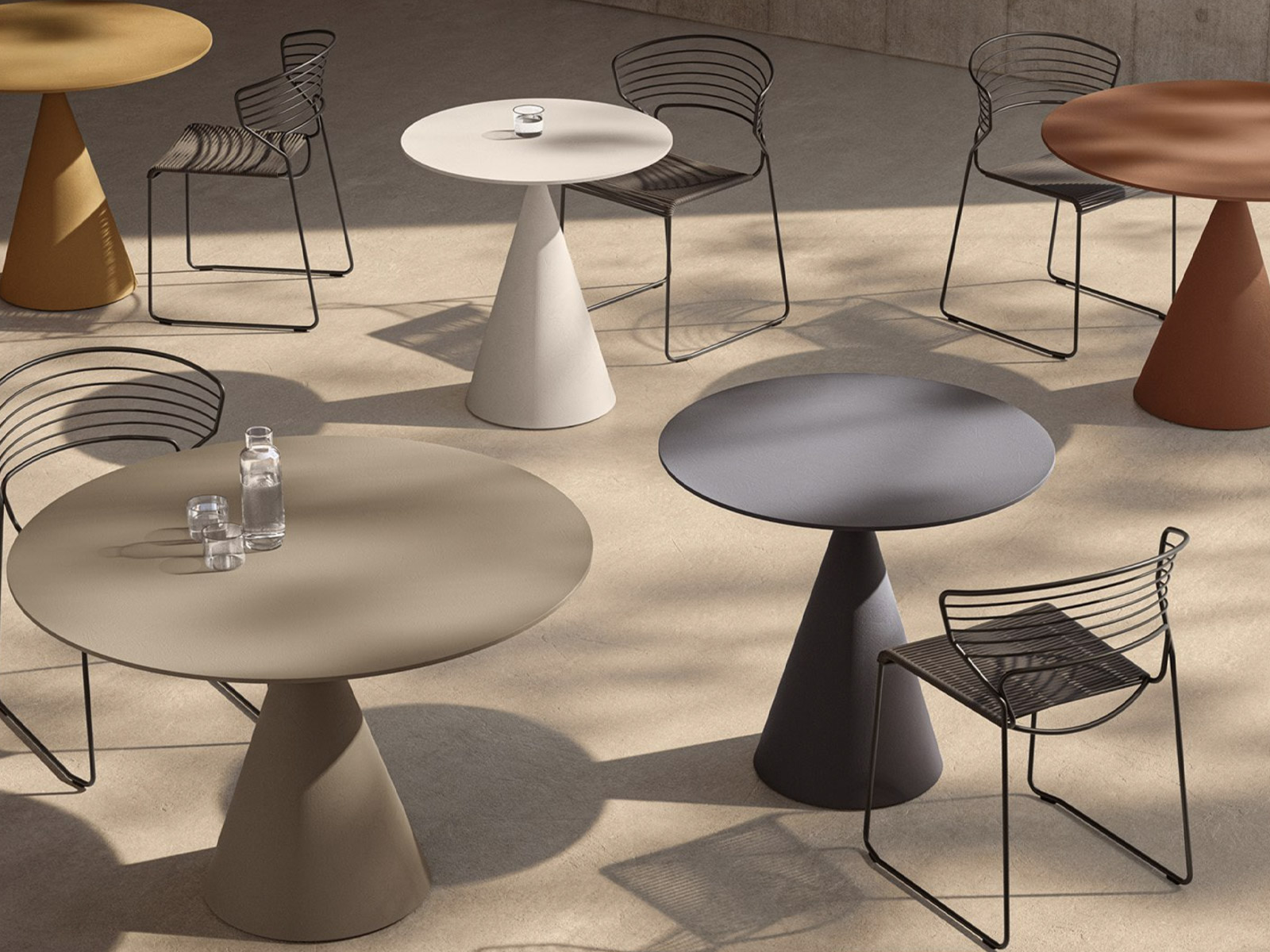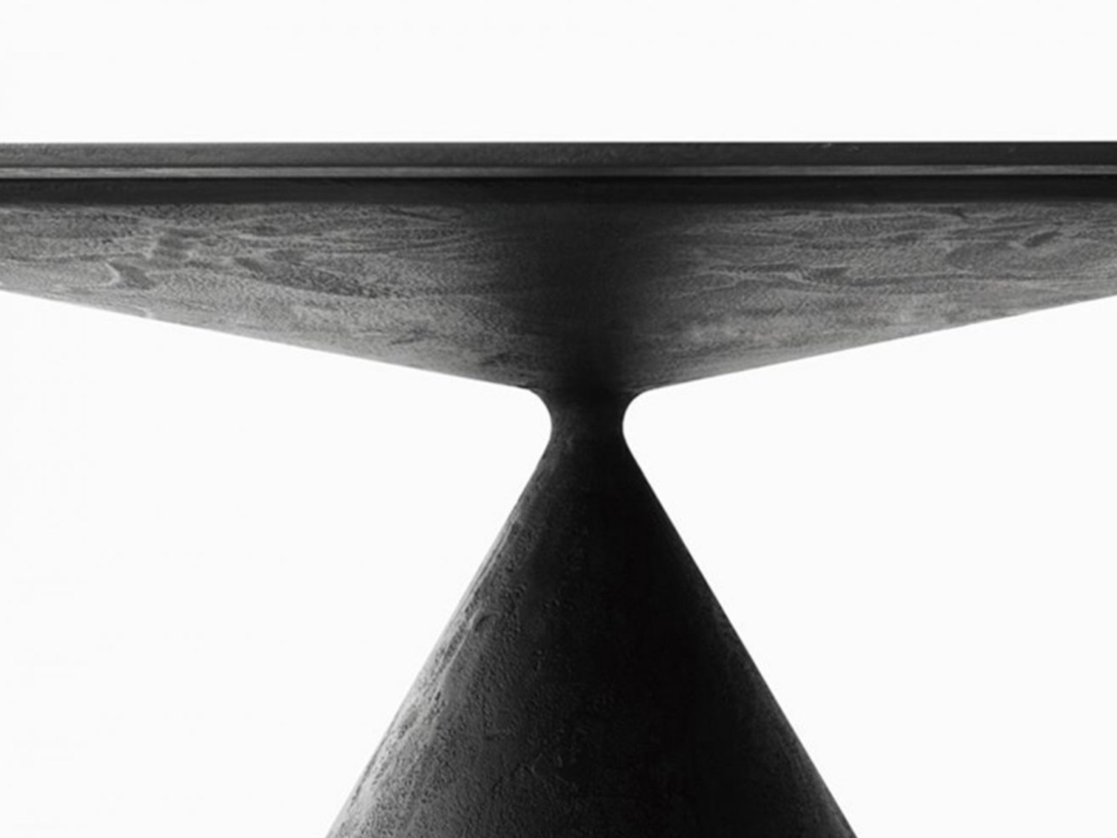 Two cones of different shapes meet at their opposite vertices: defying gravity in an apparently unstable equilibrium, but giving shape to the most classic of round tables. Clay is the exception that becomes a rule, like design.