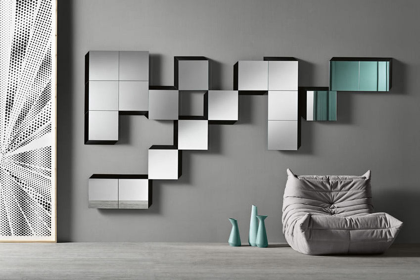 The design's main character is the frame, made of a black wooden back panel surrounding the reflecting elements and giving the entire parallelepiped composition a three-dimensional impression.